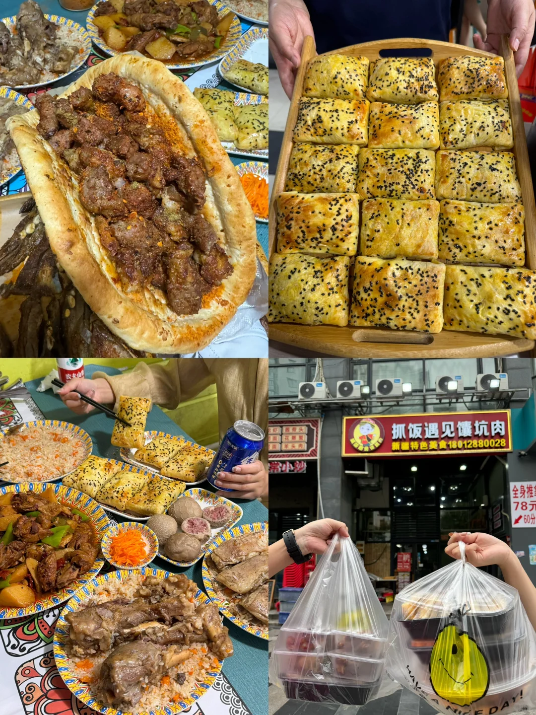 3️⃣抓饭遇见馕炕肉✔️这家是朋友让我一定要来吃的 手抓饭 馕烤肉 红柳羊肉串 烤包子 …真的巨香😌 吃不完舍不得浪费 还带走了