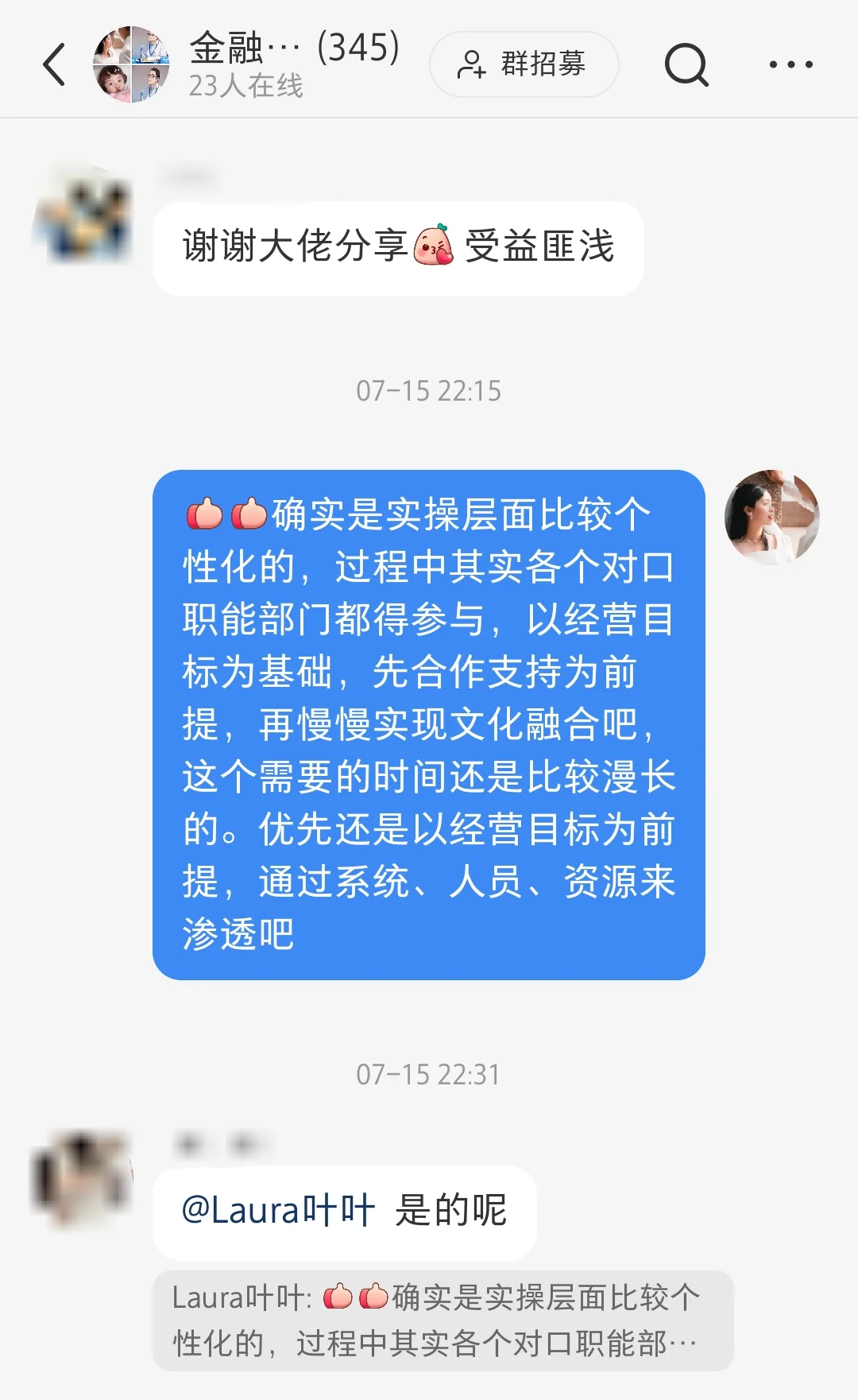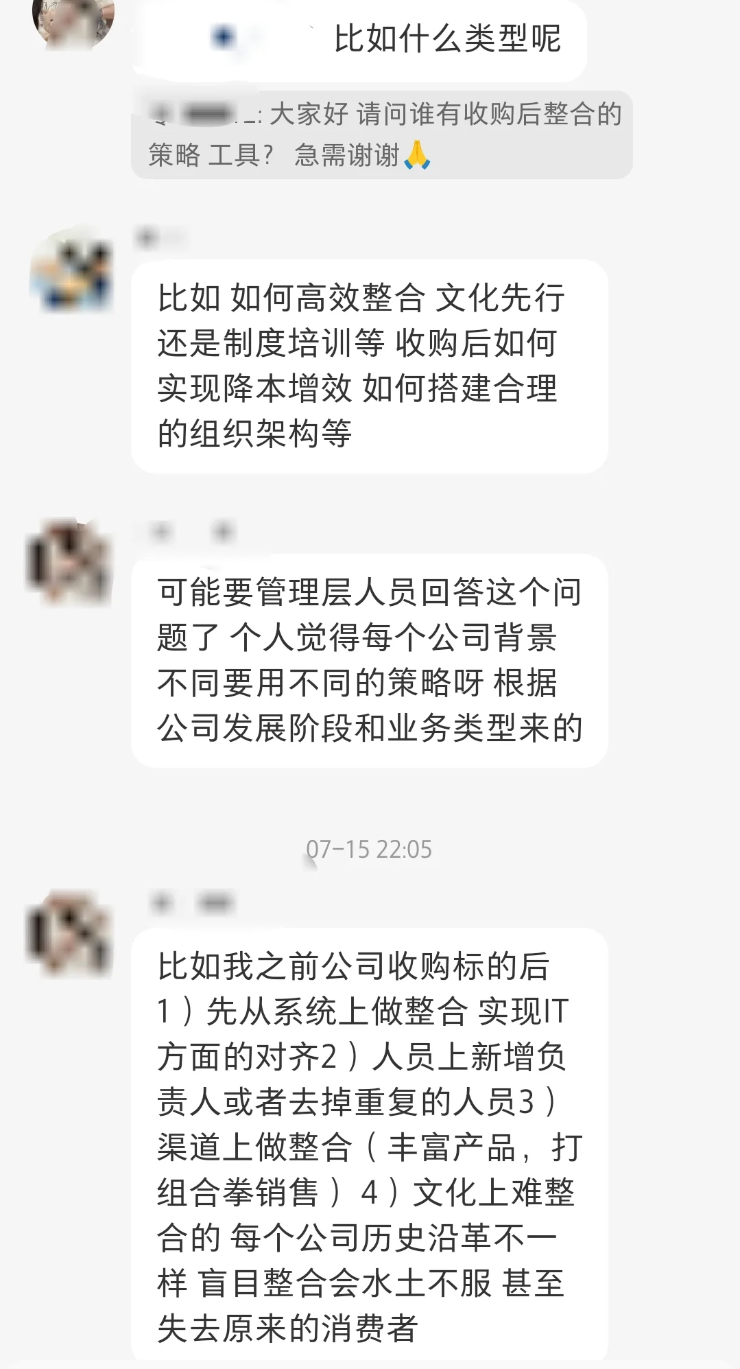 最近发现大家对于这方面内容的关注确实越来越多了,可能各家企业在产业布局和融合的过程中也慢慢意识到了整合管理的难度与重要性。本人其实也只是在干中学的过程中做些阶段性思考和总结,并不算什么经验知识分享,更开心的是看到了交流群里有更多的小伙伴针对这一问题分享一些来自各自实践经验的心得体会,在此也截几张聊天记录分享给大家~