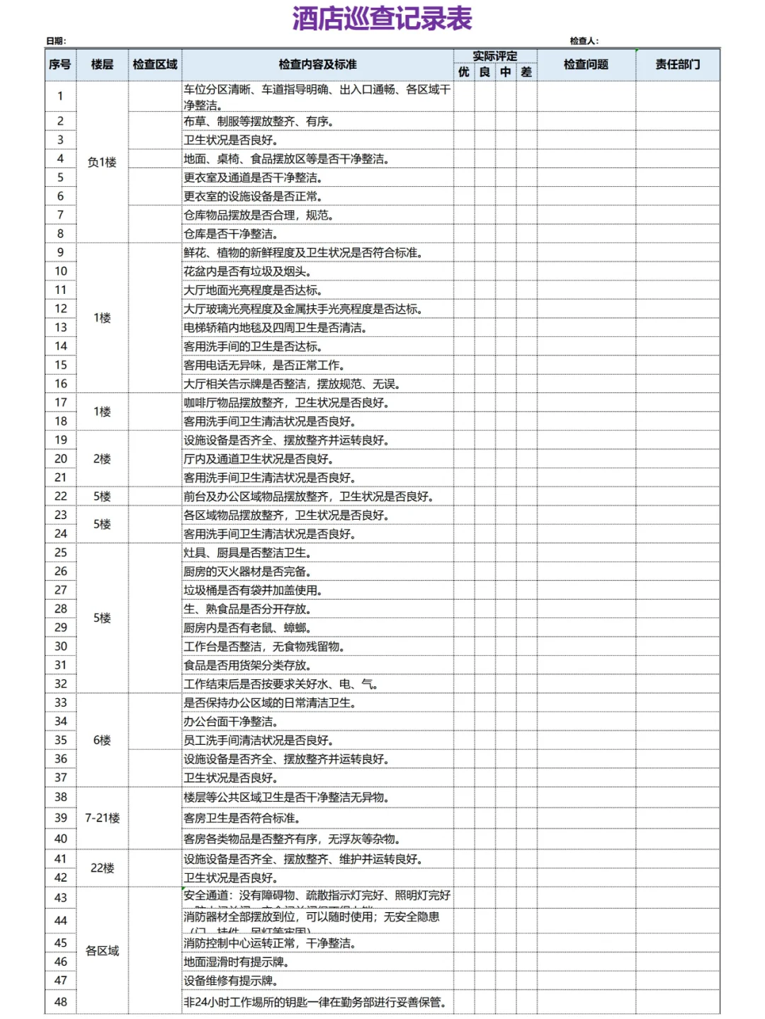 巡查表就像一位细心的环境优化师,它确保办公室的每一个角落都干净整洁,绿植盎然,让我们在舒适的环境中高效工作。🌿 人事行政巡查表就是职场中不可或缺的“导航仪”,它引领我们走向更加高效、舒适、和谐的工作环境。🌈
