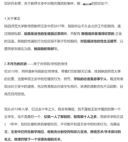 早在2015年,就有女生拿着打印的聊天记录,找到陕西师范大学纪委,当面举报教师王安中对起性骚扰行为,