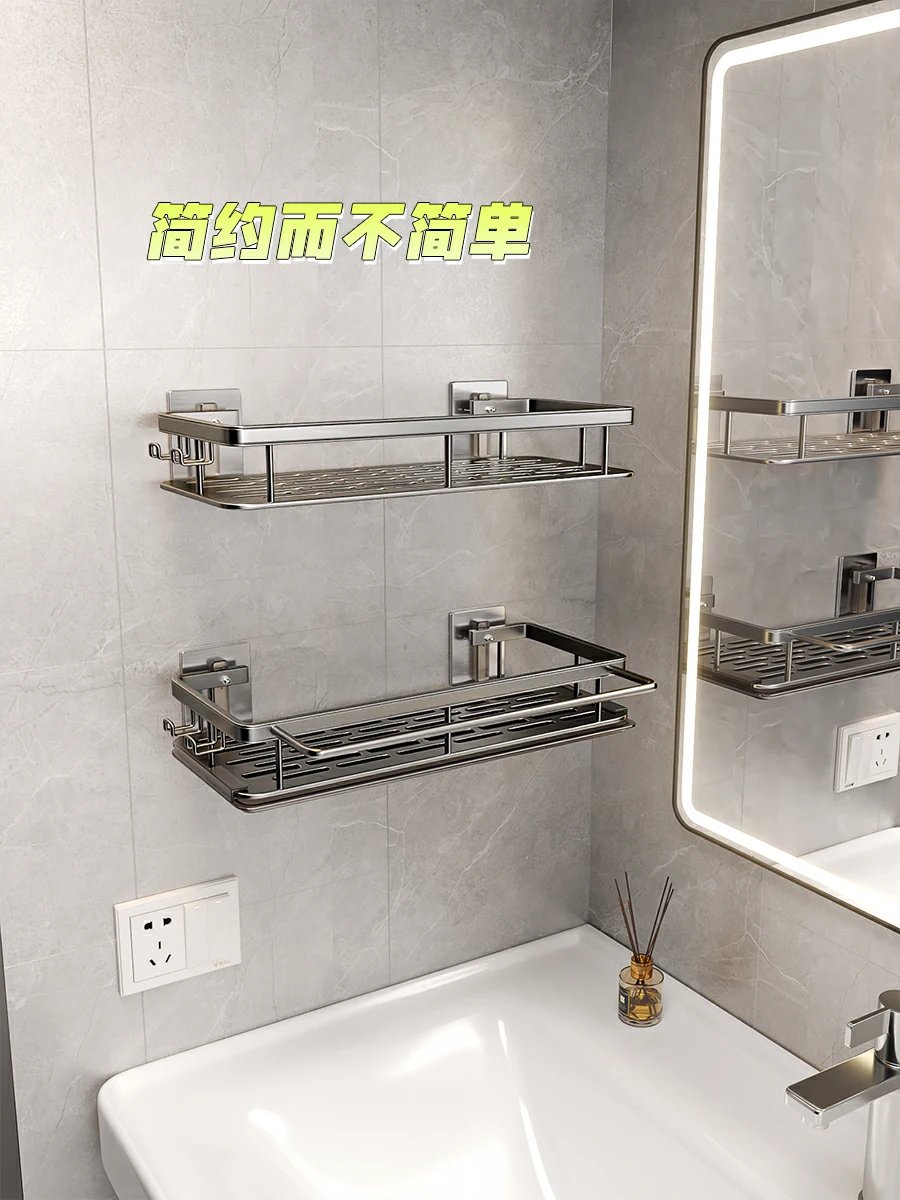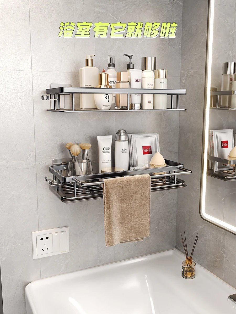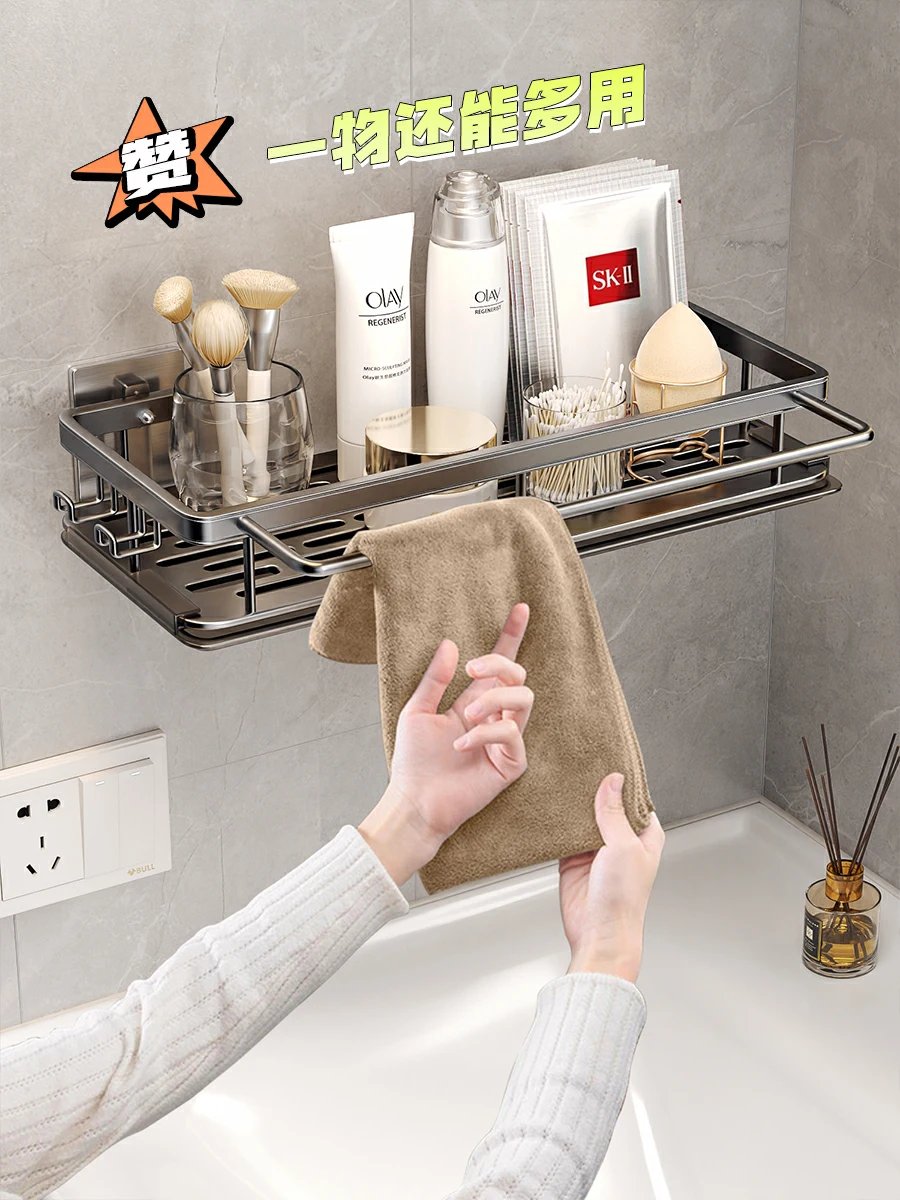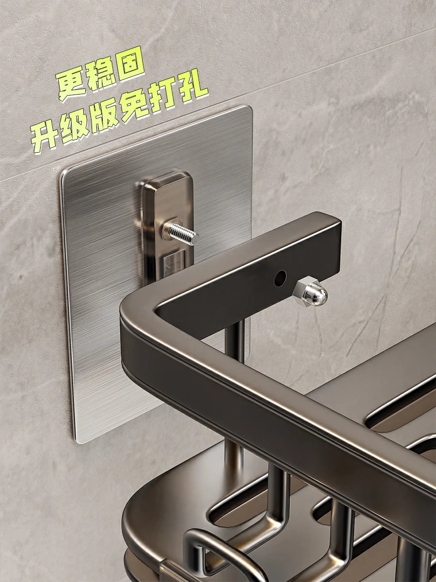这款置物架免打孔不伤墙,竟然还是螺母背胶安装的,简直太有安全感了,根本不怕掉落,瓶瓶罐罐们的家。上面还带有毛巾杆,挂皮筋的挂钩,设计真的太贴心了💯💯💯,一架全部收纳,。底部通风沥水,还有带沥水盘的款式,nice💕💕💕