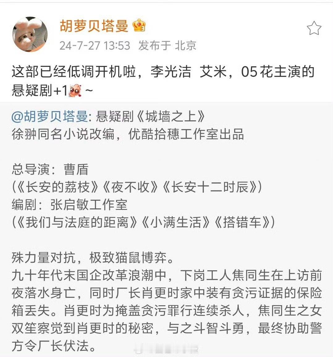 #艾米第一部女主剧#悬疑剧《城墙之上》已于昨日开机,李光洁、艾米、朱珠主演,这也是艾米的首部女主剧,期待她的精彩表现呀[比耶][比耶][比耶]