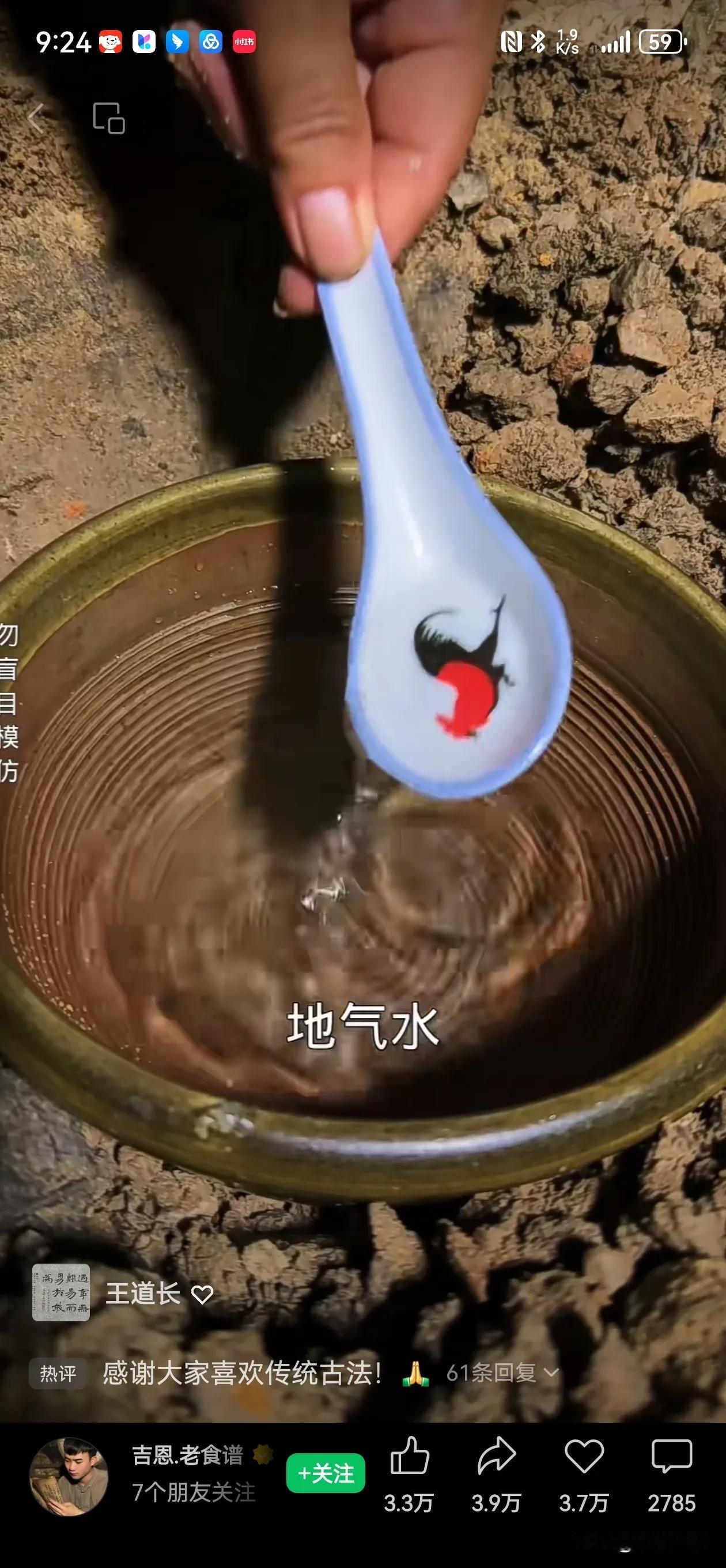 古法取水:陶碗加热后,陶碗内外形成气压使得泥土里和空气中的水分(露水)滲入陶碗,在高温下变成水蒸汽再经过倒置的盖子(犹如地球大气层凝结雨滴)滴入碗里。地气水由木炭生火引湿土之水,补脾土,益气活血,再加入艾草生姜,功效可想而知。