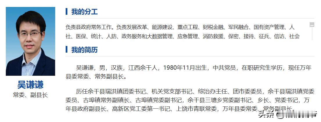 万年县真是个神奇的地方!这里不仅有美丽可人的李佩霞,有深夜约聊的毛奇书记,还有16岁就踏入职场的天才副县长吴谦谦。 1980年11月出生的吴县长,论年龄比我还小几个月,但人家在我上高二的时候就已经上班了,从婺源茶校茶叶专业毕业后,直接就担任了共青团上饶市委员,此后几年,接着担任余干县瑞洪镇团委书记、综治办主任,毕业5年后,就晋升为实职副科级干部,担任余干县洪瑞镇党委委员,此事我还在读大二。 人生的差距,从此越拉越大,如今,吴谦谦这位天才少年已经是万年县常务副县长副处级干部了,在县委班子中排名第六,原来排第一的毛奇书记,已经主动找组织喝茶了。吴副县长管理着全县几十万人,大权在握,而我依然游荡在社会底层,拿着微薄的收入苦逼地生活着。 虽然他振振有词地说绝对不存在年龄造假,但是网友们似乎并不买账,就看当地能否给出一个相对客观公正的回应了,毕竟年龄造假这事情可大可小,如何处理靠的是春秋笔法。 #16岁参加工作?干部回应履历遭质疑#