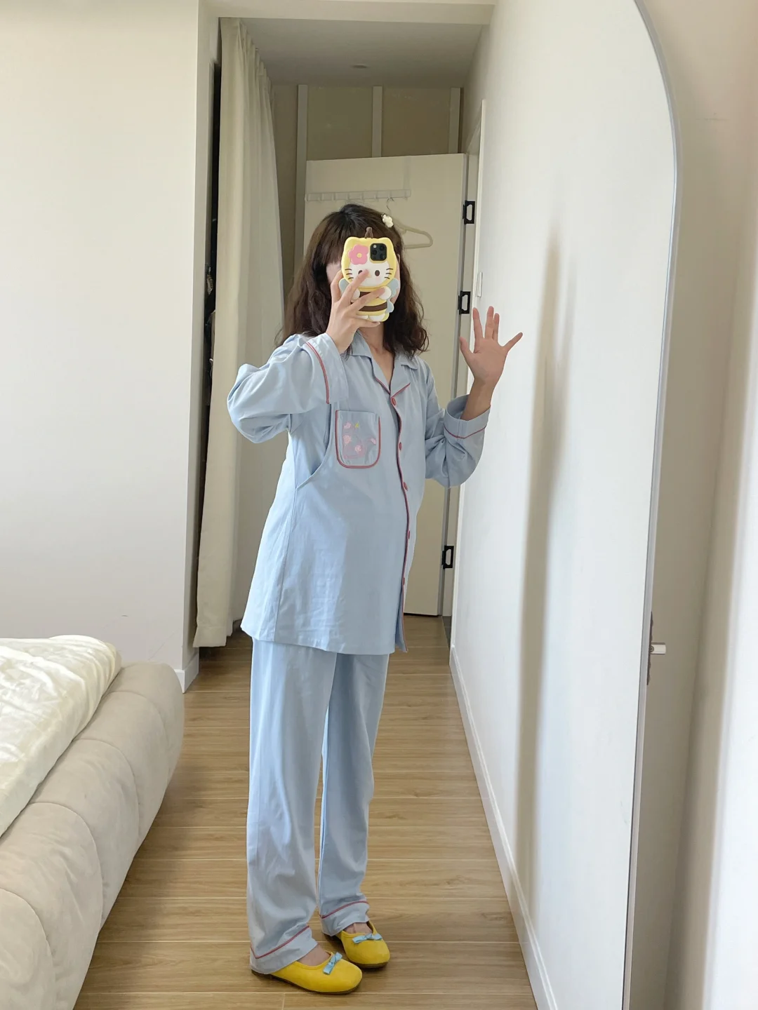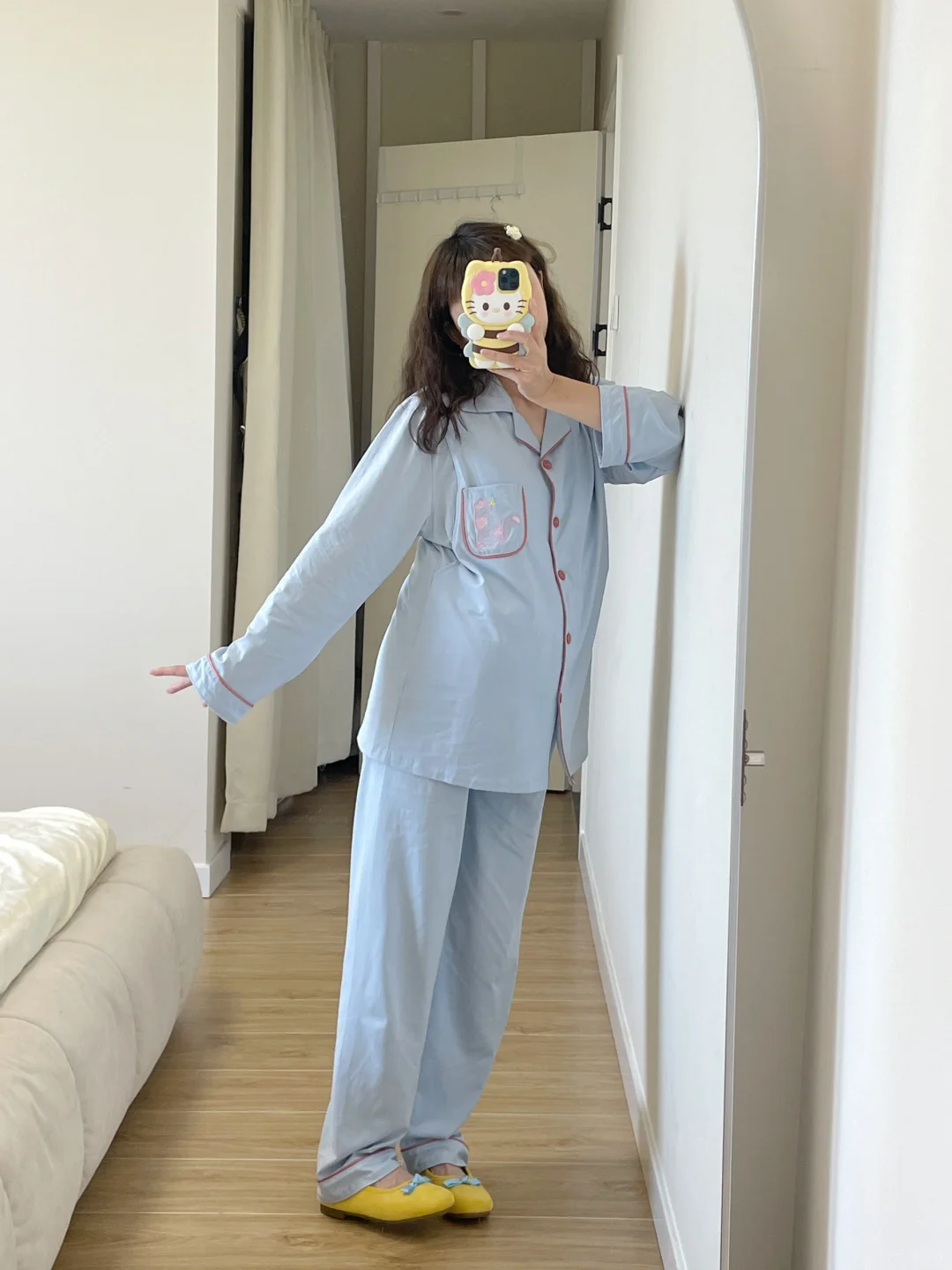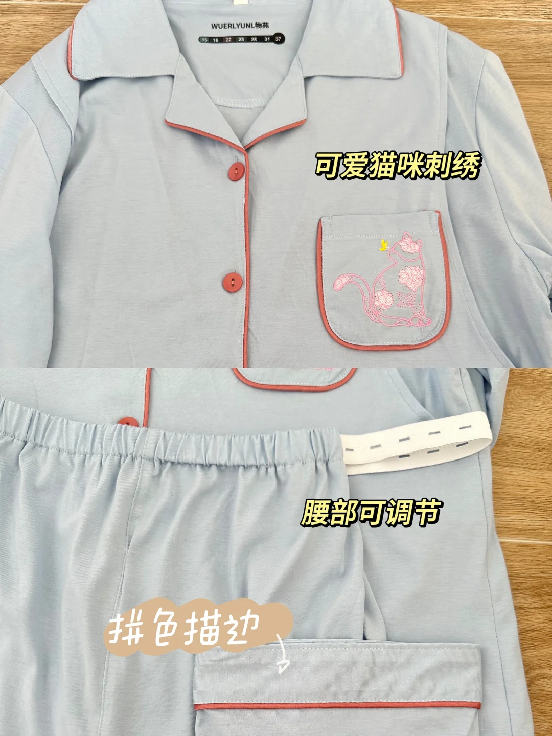 这一套面料真的很舒服、是纯棉的!颜色是一种很特别的蓝色~再加上水粉色的点缀就很亮眼!胸口还有刺绣的小猫咪,还蛮精致的!无论是夏天还是秋天坐月子穿都很合适~腰部有调节带、轻松从孕期穿到产后哦!