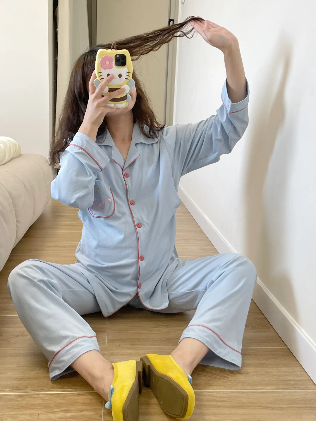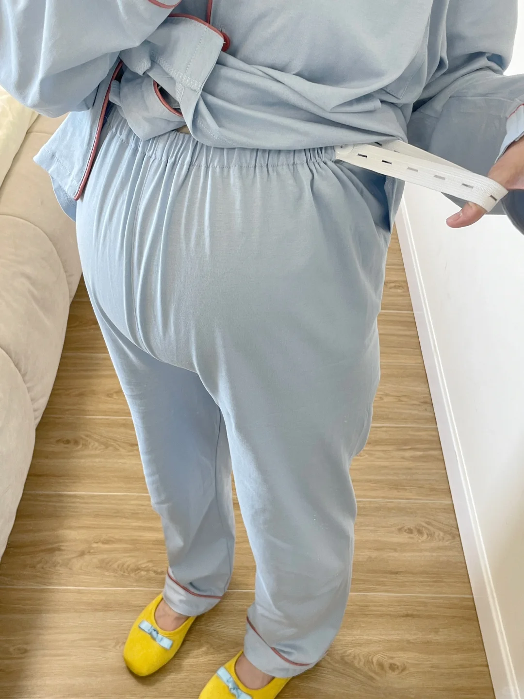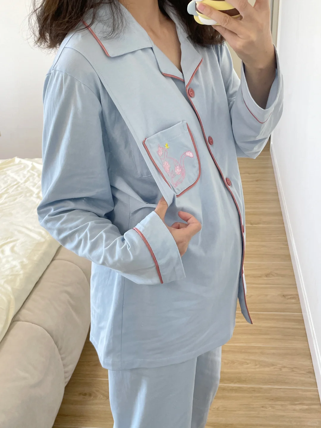 这一套面料真的很舒服、是纯棉的!颜色是一种很特别的蓝色~再加上水粉色的点缀就很亮眼!胸口还有刺绣的小猫咪,还蛮精致的!无论是夏天还是秋天坐月子穿都很合适~腰部有调节带、轻松从孕期穿到产后哦!