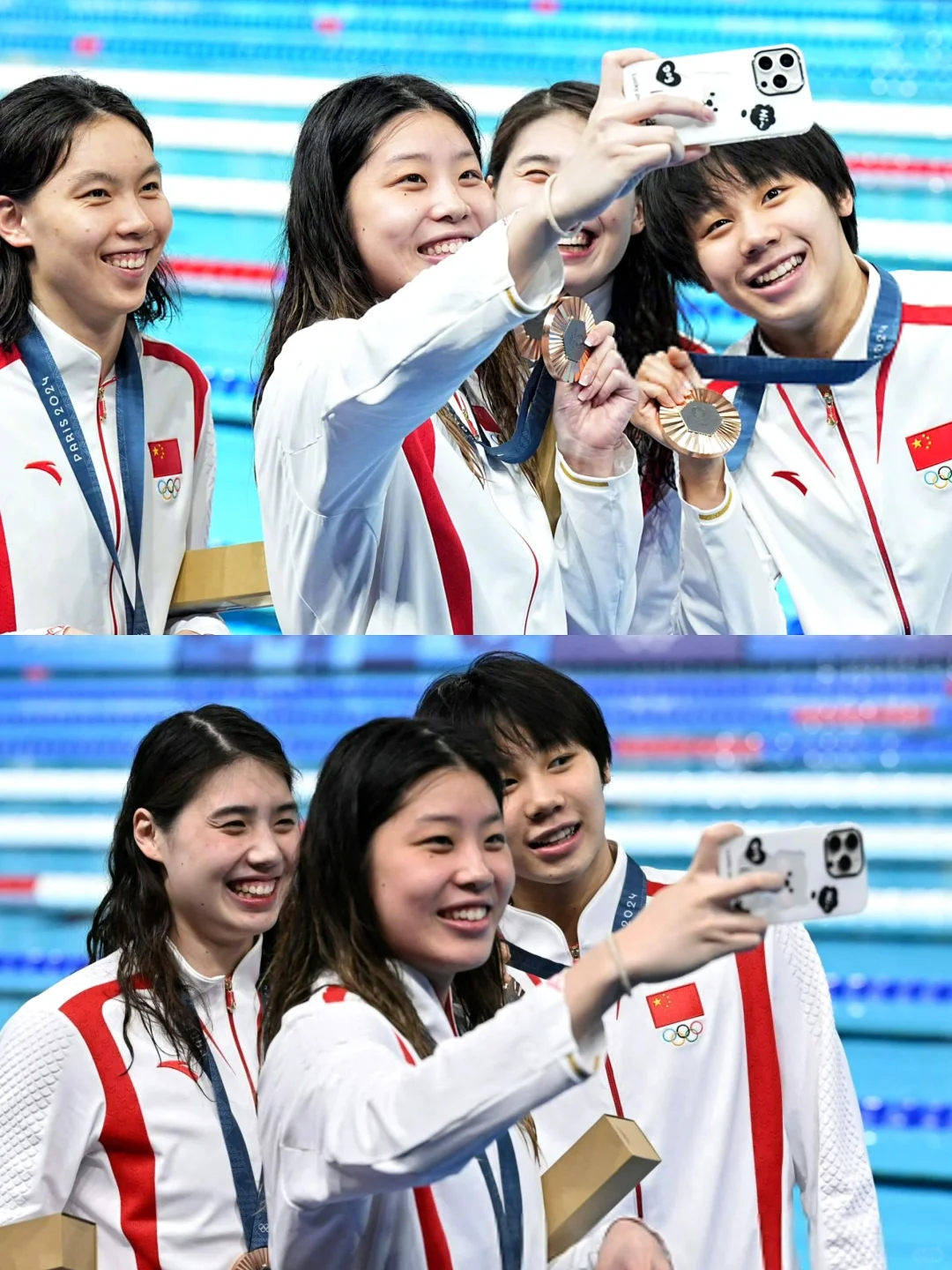 女子4x100米自由泳接力决赛比赛完组员一起自拍的有爱画面,手机壳也特别可爱~☺️