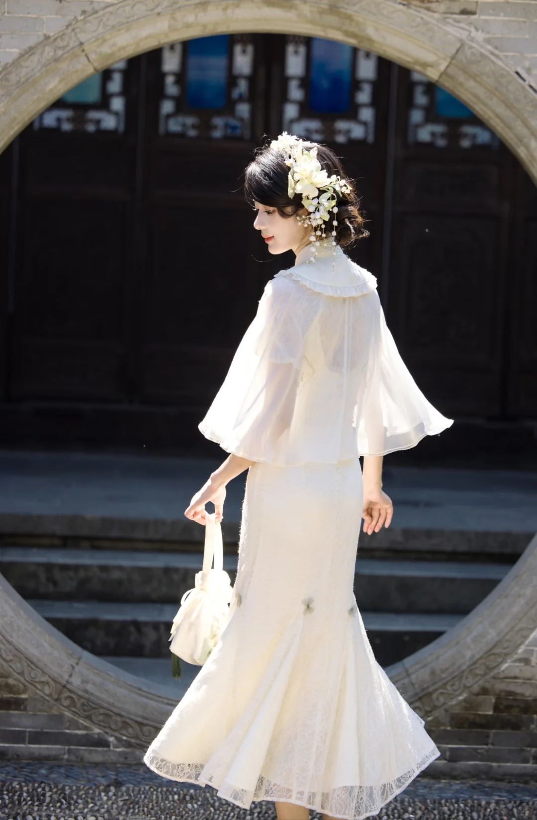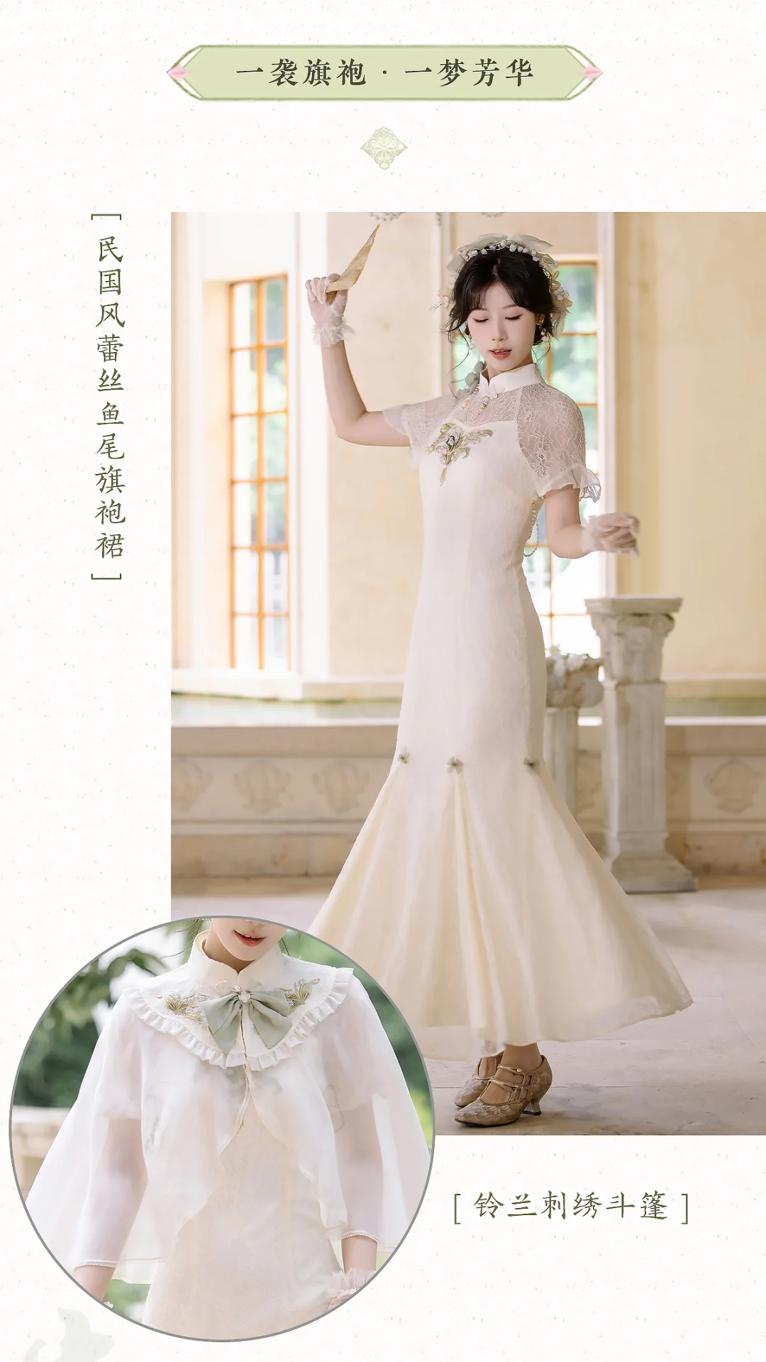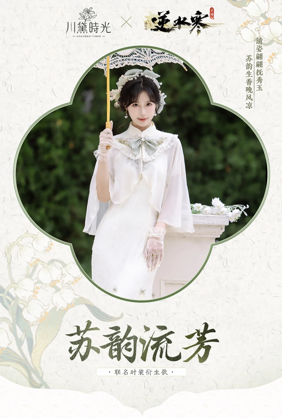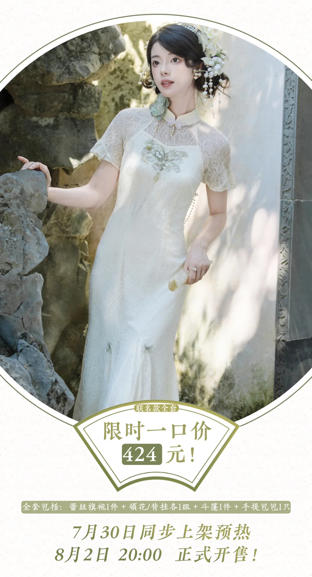 “清姿翩翩抚秀玉,苏韵生香晚风凉。” 筹备已久的联名,终于和大家见面啦!这次我们迎来了一个新朋友· 我们根据游戏时装做了相应的简化设计,加入了部分衍生元素,设计出了这款蕾丝鱼尾旗袍+斗篷套装。 在传统国风元素的基础上融入了现代时装审美,以温婉优雅之姿,呈现东方之美。 · 一袭旗袍,一梦芳华。八月 我们携手逆水寒 邀你一同入梦~