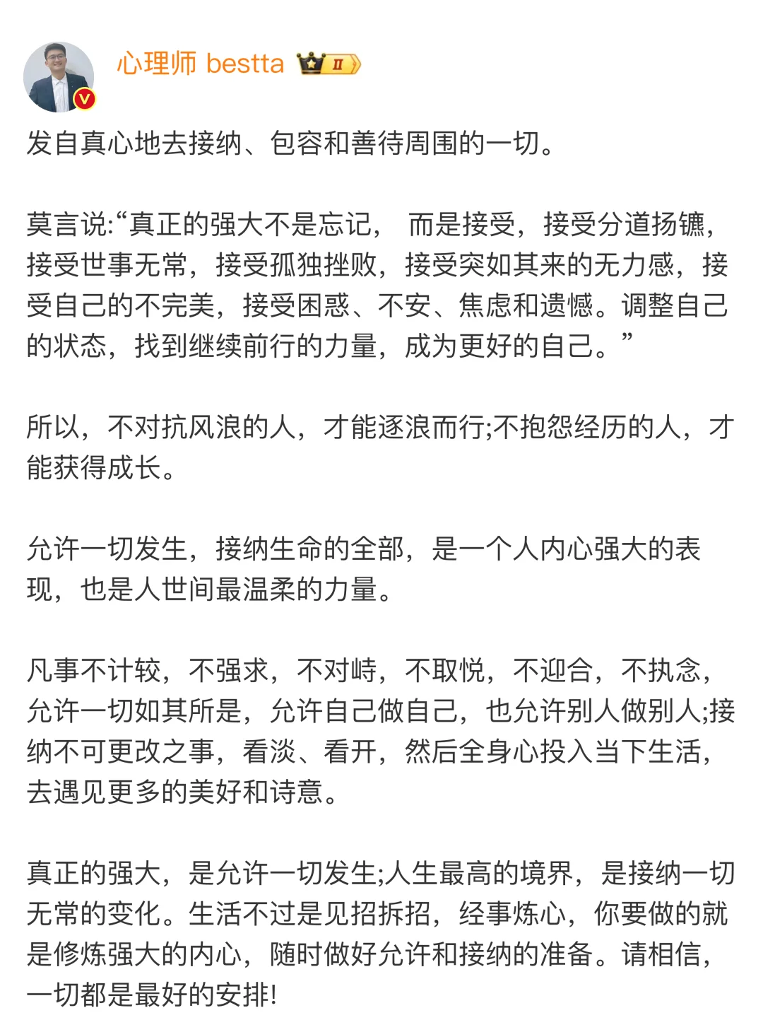 真正的强大,是允许一切发生;人生最高的境界,是接纳一切无常的变化。生活不过是见招拆招,经事炼心,你要做的就是修炼强大的内心,随时做好允许和接纳的准备。请相信,一切都是最好的安排!