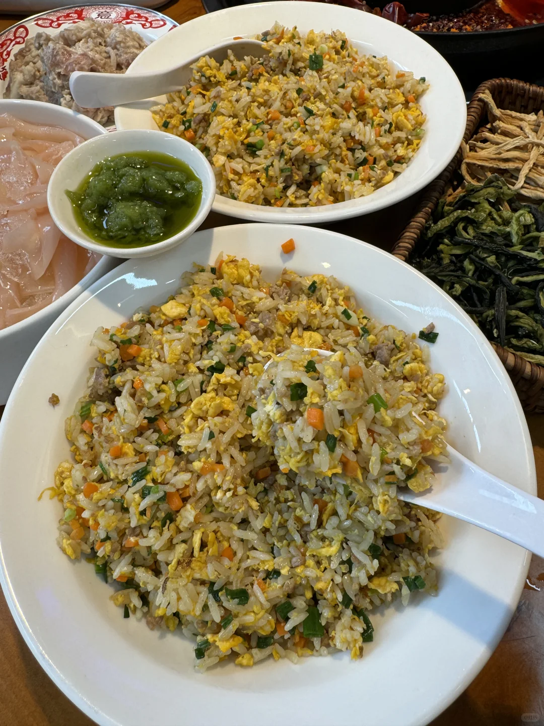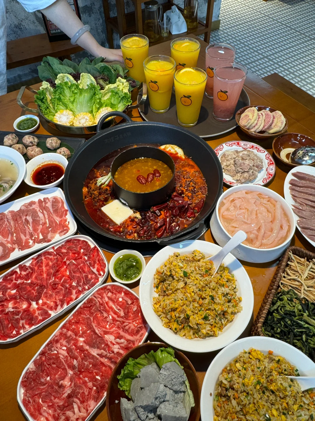 鲜蒸的羊肉烧麦配上韭菜花 谁懂这一口有多鲜🥹🥹🥹 还有这家的牛肉碎蛋炒饭 真的无di分量也特别足👍🏻 黄柿子鸳鸯锅底很特别 番茄味道好浓郁 鲜甜鲜甜的 汤底能直接喝诶 很适合涮素菜🥬 牛油锅底越煮越香 还带着丝丝甜味 这个味道涮东西真的吃不够! 蒜香排骨✔️(入口脱骨 肉感好足 )皮蛋肉丸✔️(煮出来口感好绝)鲜切吊龙✔️麦穗厚腰子(都是吃的出来鲜货~) 最后再来一杯鲜榨橙汁🍊真的好过瘾😌