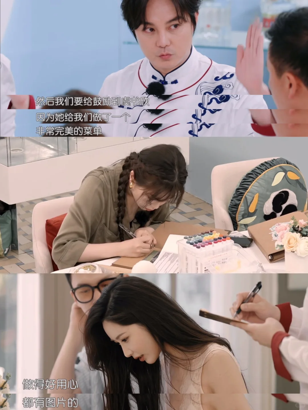 她拍摄、手绘的菜单,让顾客觉得看起来很舒适,被尹正表扬[赞R] ,她也不忘感谢一起制作的小伙伴。在后厨念菜单,她字正腔圆,也受到了林大厨的高度赞扬【你这是用感情在报菜单。】