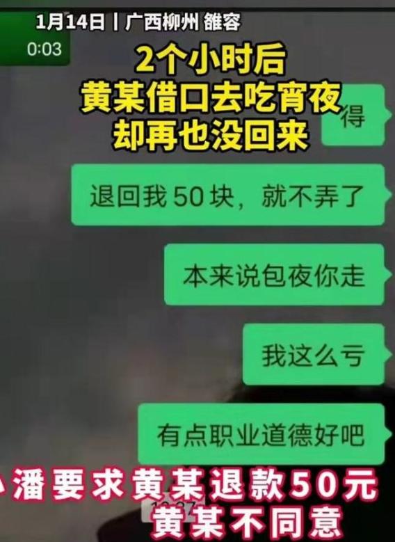 “太炸裂!“广西,一18岁男子花600块钱,约47岁失足妇女到宾馆包夜,岂料,两人发生不正当关系后,大妈说肚子饿了,想出去吃宵夜,结果却一去不复返!男子大怒,认为大妈不讲职业道德,当即打电话报警,结果却悲剧了! ((信源:光明网——“包夜”却中途离开,18岁小伙斥47岁失足女:没职业道德)) 这天,派出所闯进一个满脸泪水的男子,他自称姓潘,自己刚刚被人诈骗了,然而当警方要他交代事情经过时,男子却语出惊人道:“那个失足女太不讲职业道德了!” 一切还得从昨天夜里说起,18岁的小潘躺在出租屋里,因为常年在外打工,性格内向,连异性的手都没拉过,正当其浴火难烧时,屏幕上突然蹦出一个打扮香艳的头像,备注写着“特殊服务,包爽,让你今夜不在寂寞!” 接下来,小潘红着脸点开,和对方聊了起来。女人姓黄,在得知潘某还是处男后,便不住的勾引他,最终两人达成交易,600块包夜。 这头的小潘兴冲冲就往约定的酒店跑去,然而左等右等,网上的女神却迟迟没有踪影。正当他饥渴难耐时,门被推开了,只见一身材婀娜的女人,裹着清凉的衣服走了进来,在灯光的照耀下,一身的脂粉味瞬间迷住了男人的眼。 下一秒,小潘如饿虎扑食,和女人当即滚起了床单。几分钟后,女人突然捂着肚子说饿了,转头穿好衣服出了门。 这头的潘某百无聊赖,边玩着手机边等待佳人,刚才的浅尝辄止勾起了他的兴趣,今夜准备大战300回合呢! 然而,半小时过去了,还是不见黄某回来,难不成她半路遇到危险了? 担心之余,男子给女人打去了电话,结果却始终无人应答,发微信也是不回。事已至此,他终于恍然大悟——这是遇到女骗子了! 说好的600包夜,怎么做到一半人跑了,职业素质呢?做人的品德呢?怀着怒火,男人给黄某发去信息,要求她按照规矩,退掉余下的费用,哪怕50块都好。 但女人摆明了要“黑吃黑”,拿捏着男人不敢报警的心理,一分钱都不退。最终,恼羞成怒的小潘推开了派出所的大门,发誓要让失足女黄某付出沉重的代价! 结果,让人大跌眼镜的一幕出现了,当黄某落网后,男人才发现,除去脸上的妆容后,对方竟然比自己大了足足30岁!一想到,自己和年近半百的老女人有了肌肤之亲,男人恶心的差点隔夜饭都吐出来了。 尽管如此,小潘还是要为自己的冲动付出代价,按照我国法律,卖淫以及嫖娼均要处以10日行政拘留并处罚金。 希望每个人都能洁身自好,正大光明的谈恋爱行使幸福的权利,远离那些肮脏污秽的角落。