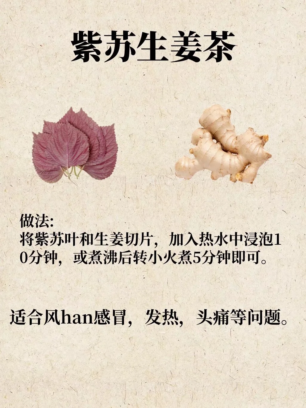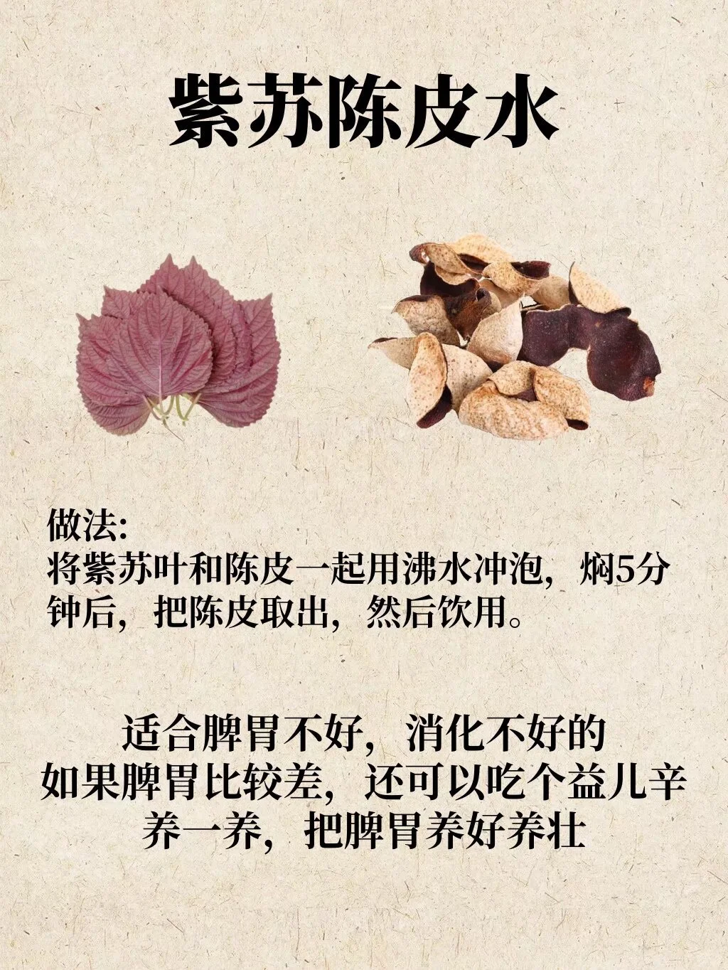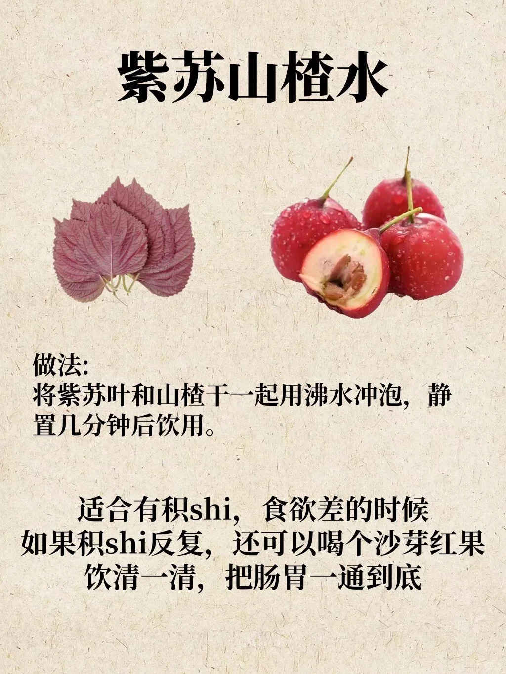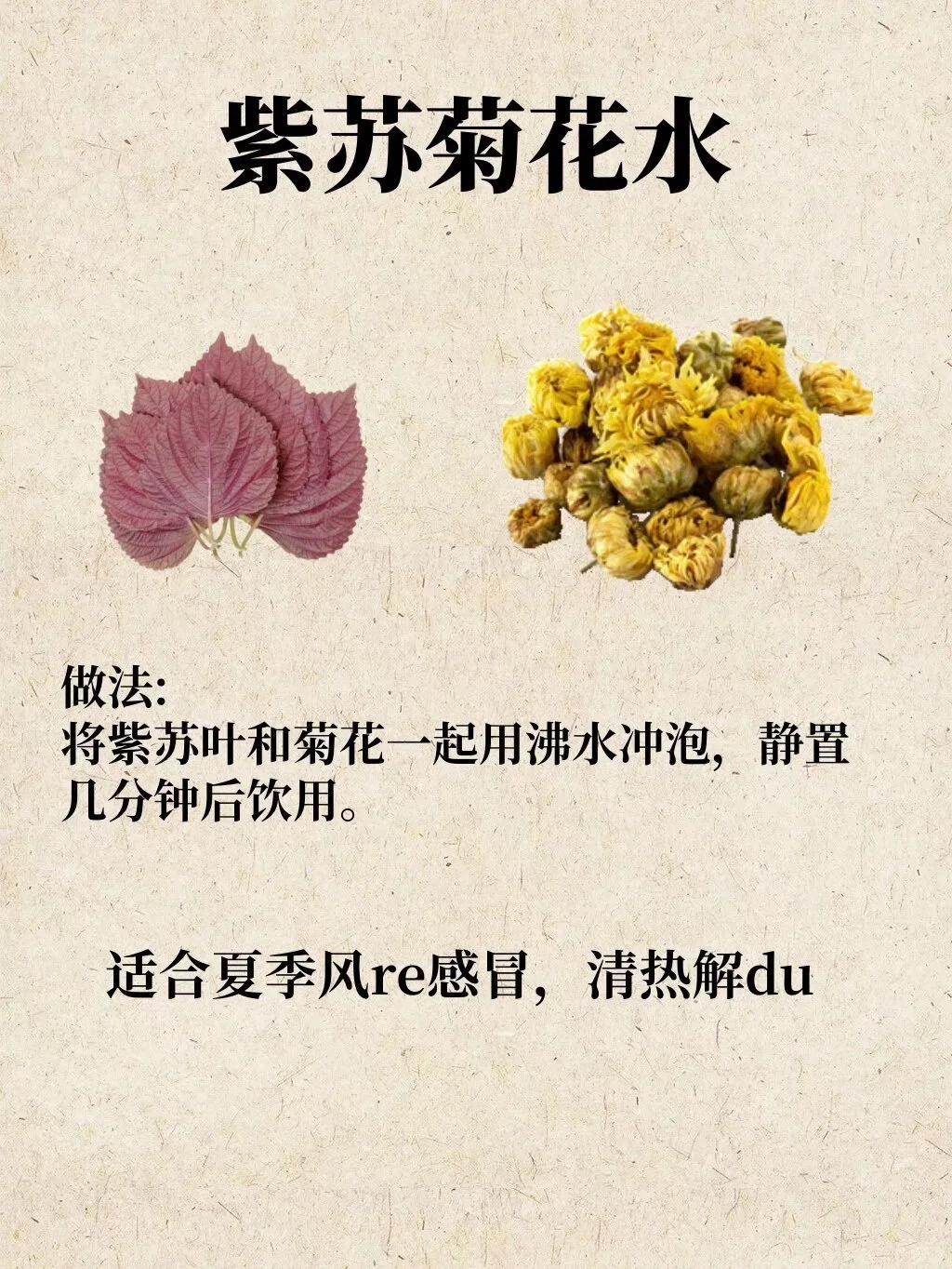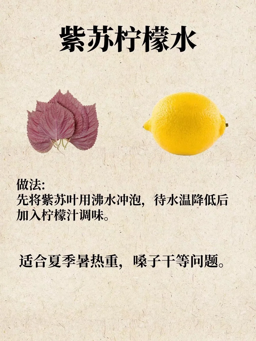 🌿紫苏,又称“纯阳之草”,是一味中药,性味辛温,归肺、胃经,一身都是宝。 - 📕在《本草汇言》中记载紫苏具有解表散寒,行气宽中,所以我们夏天吃点紫苏是非常适时的~ - 1、紫苏菊花茶 2、紫苏陈皮水 3、紫苏生姜茶 4、紫苏柠檬水 5、紫苏山楂水 -