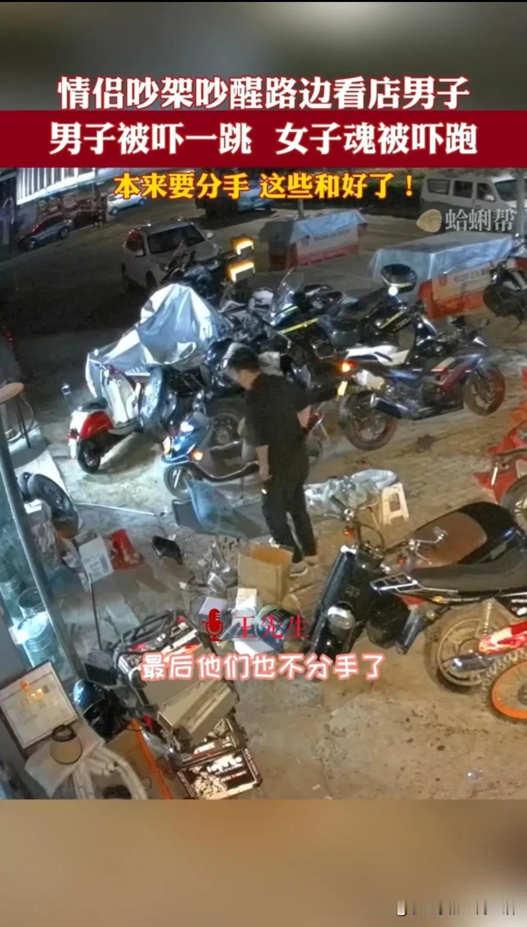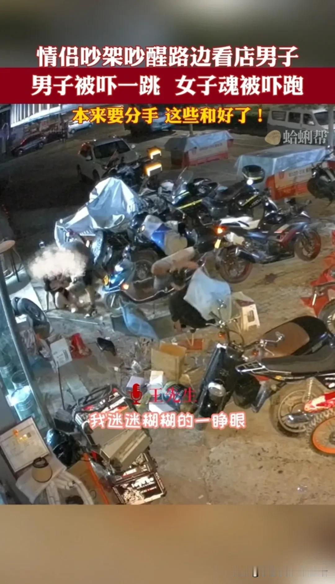 大哥牛逼半夜睡醒撮合一段感情!大哥在店门口睡觉看着摩托车,睡到半夜一对情侣路过嚷着要分手把大哥吵醒了,顺便把准备分手的男女撮合了,睡个觉也能保住一段姻缘。