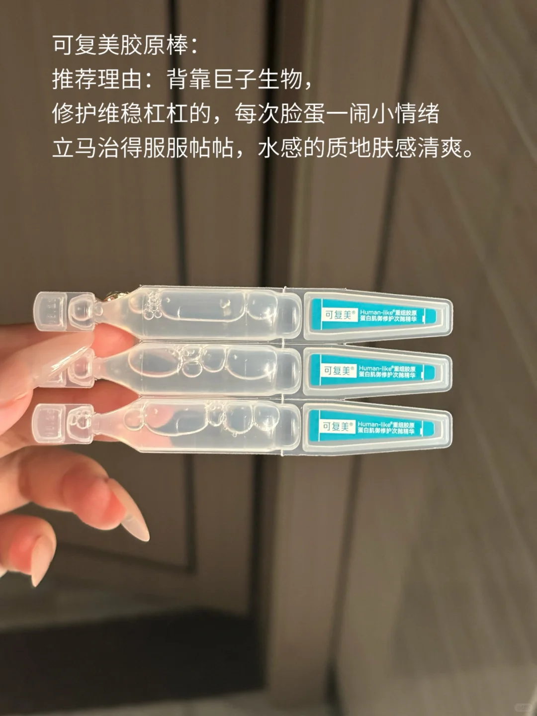 可复美家有好几款,这款虽然是妆字号,但非po皮后也能用,po皮建议用液体那款,从修护屏障+补水保湿来说都很不错,含有1型和3型重组胶原,背靠巨子生物真的一万个放心的!每次做完项目后皮肤都红痛痒的,用它都能安抚好,质地偏清爽水润不黏腻很好吸收。日常敏皮泛红、猛药打底都能用,用它都有很好的效果!