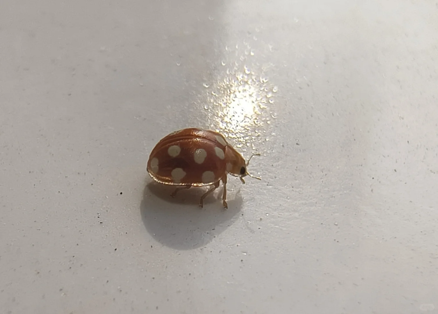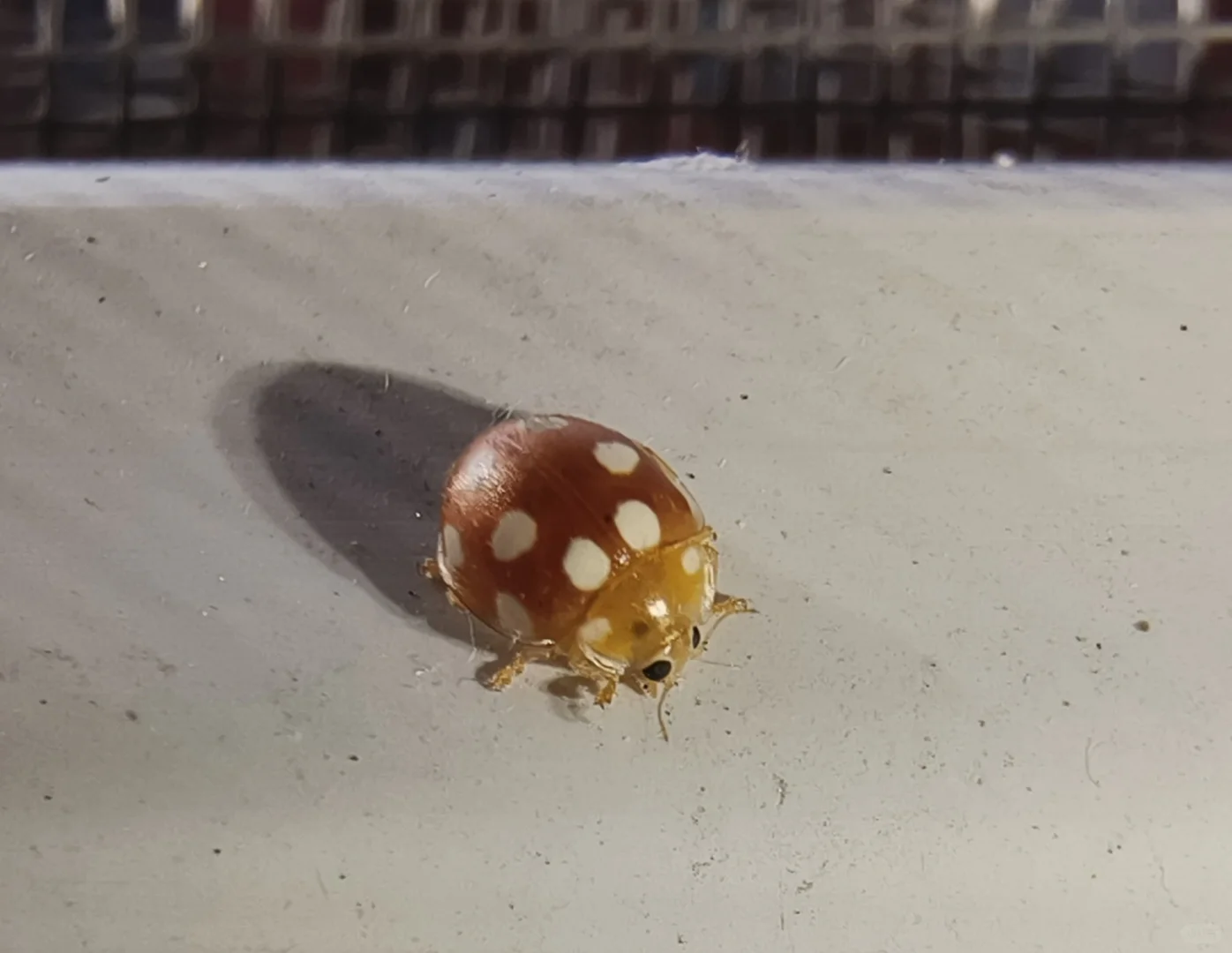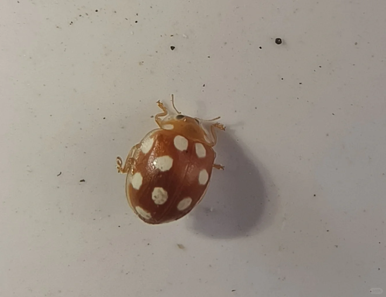 家里窗台偶然发现一只体色鲜亮,有些透明质感的瓢虫,和以前见过的那些不太一样,经蝶友 指点,确认为十二斑褐菌瓢虫Vibidia duodecimguttata。亦称为白瓢虫。体长约4mm。体色为黄褐色,有淡白的斑点。以白粉病菌等维生。属于菌食性瓢虫,这类一般体色比较鲜亮,体表光滑。
