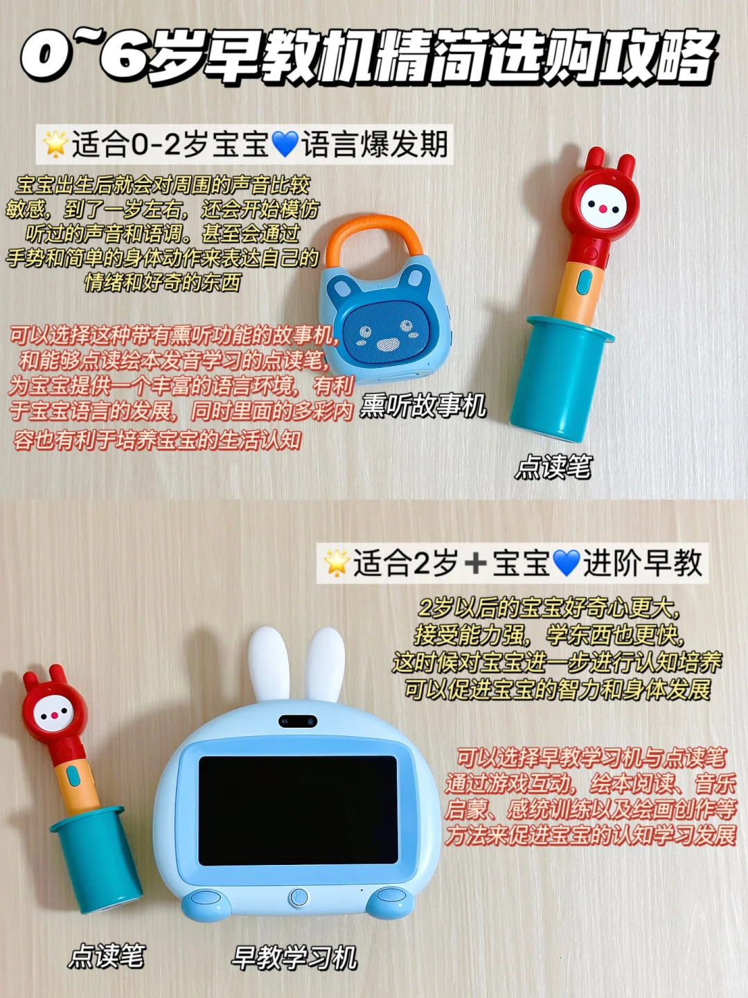 对于送早教中心还是在家早教一直都有很多争议! 我想说有条件的就送早教中心,预算有限的妈妈们也可以选择在家早教! 不过就算是去早教中心,在家也是需要给娃早教辅导的,毕竟一个教堂有很多学生,而老师只有一个,总是没那么到位~ - 自从娃慢慢长大,家里的早教搭子我也是入手了不少! 今天分享一下宝宝自用的火火兔几款早教机使用感受 - 🐰便携故事机 ▪️适合年龄:0-4岁 大宝刚出生没多久我就买回来了,每天给娃听听儿歌听听英语,古诗之类的,主要是熏听用,不出意外,娃语言爆发期来的早了不少!而且这个故事机小小一个,携带很方便,外出也能当个哄娃工具~ - 🐰点读笔➕双语翻翻书➕启蒙绘本(16本) ▪️适合年龄:1-8岁 这一套是娃一岁多入手的,那时候他好奇心很大,对什么都很好奇,看着绘本里的丰富色彩图画,听着点读笔讲故事,对话,唱儿歌别提多津津有味了~ 配套的认知翻翻书里面还有小机关,翻开又是不一样的小事物,娃每天都翻的不亦乐乎,自己能玩好久 - 🐰I6plus早教学习机 ▪️适合年龄:2-8岁 是我家宝宝的第一台学习机,专门针对学龄前早教设计的学习机。考虑到3岁娃就该上幼儿园了,所以我入手了这台提前打好基础,里面的内容很丰富,有着幼儿园必学的拼音、认字、数学、英语、百科,还有培养宝宝兴趣的绘画、科学探索之类,娃可以一下午都沉浸在学习里面~ - 带娃3年用过的早教也不少,一开始选购做功课可把我头疼坏了,踩了不少坑这才选对,建议妈妈们可以从这几点出发选择: 1️⃣小月龄主要做熏听,多听听儿歌、故事、开口学说话会更早 2️⃣1岁多的宝宝,多锻炼锻炼动手能力,同时视觉、听觉的培养也不能落下,点读笔可以开始入手了,搭配合适的绘本,可以拓展更多的认知 3️⃣2~3岁的宝宝对世界的好奇心会更重,就可以准备更丰富多样化的早教内容了,除了双语、认字、拼音字母、数字,百科内容,也可以培养宝宝的音乐、绘画、科学探索兴趣,这个阶段可以开始使用早教学习机了,视听同步输入,控制好时间和距离给宝宝看,效果更佳~