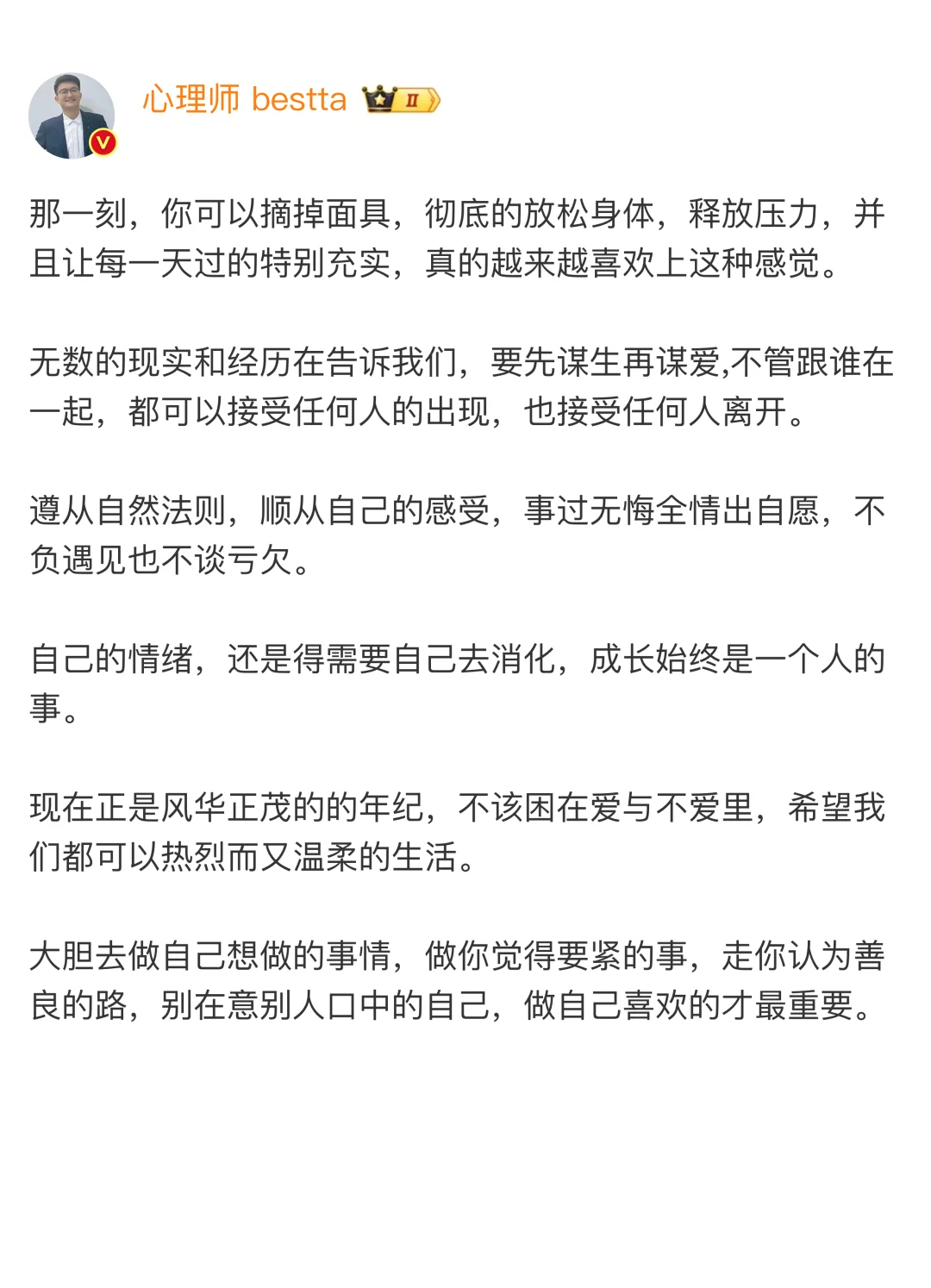 大胆去做自己想做的事情,做你觉得要紧的事,走你认为善良的路,别在意别人口中的自己,做自己喜欢的才蕞重要。