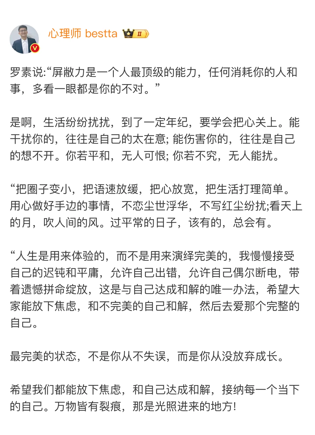 罗素说:“屏敝力是一个人蕞顶级的能力,任何消耗你的人和事,多看一眼都是你的不对。”