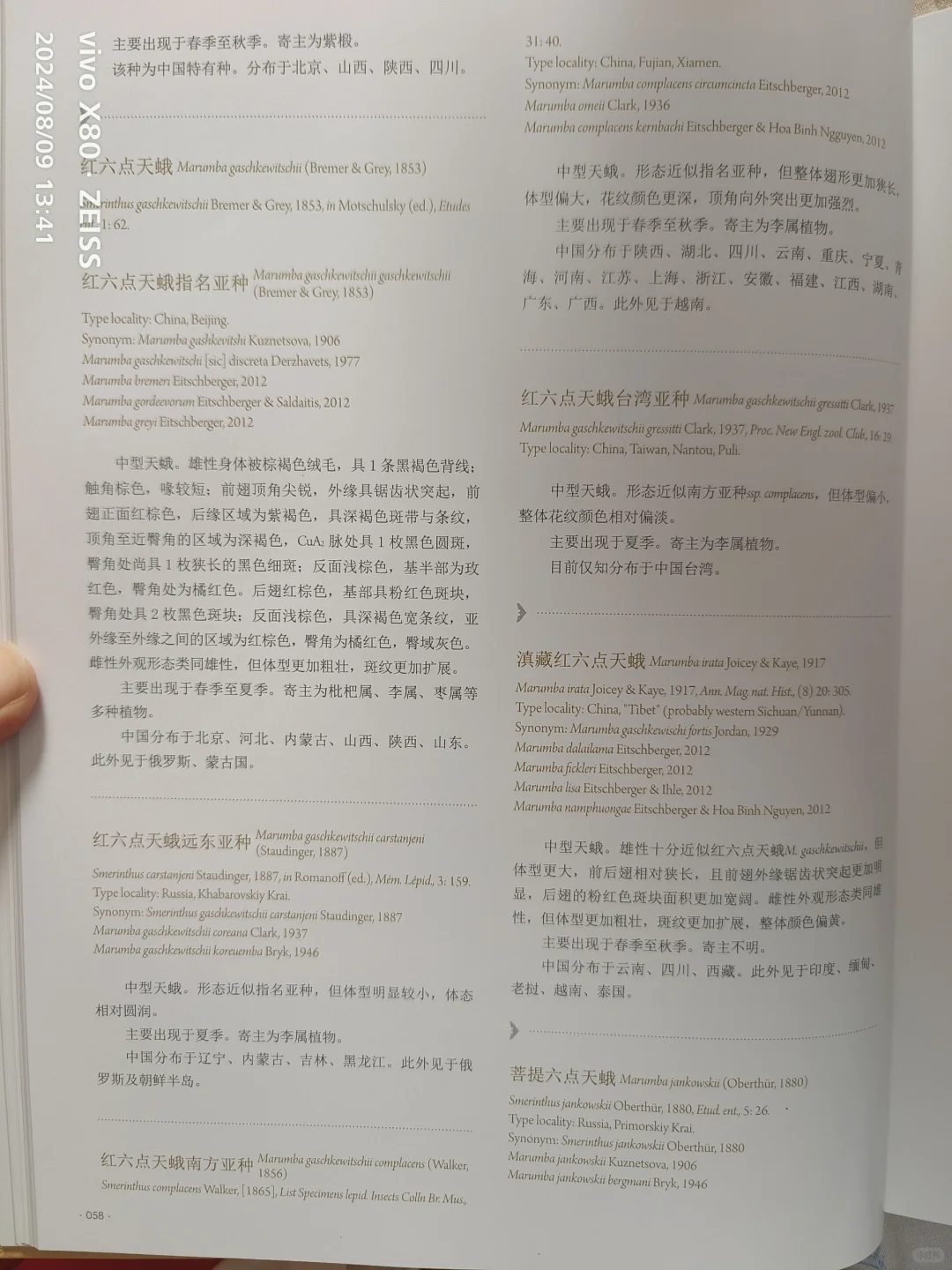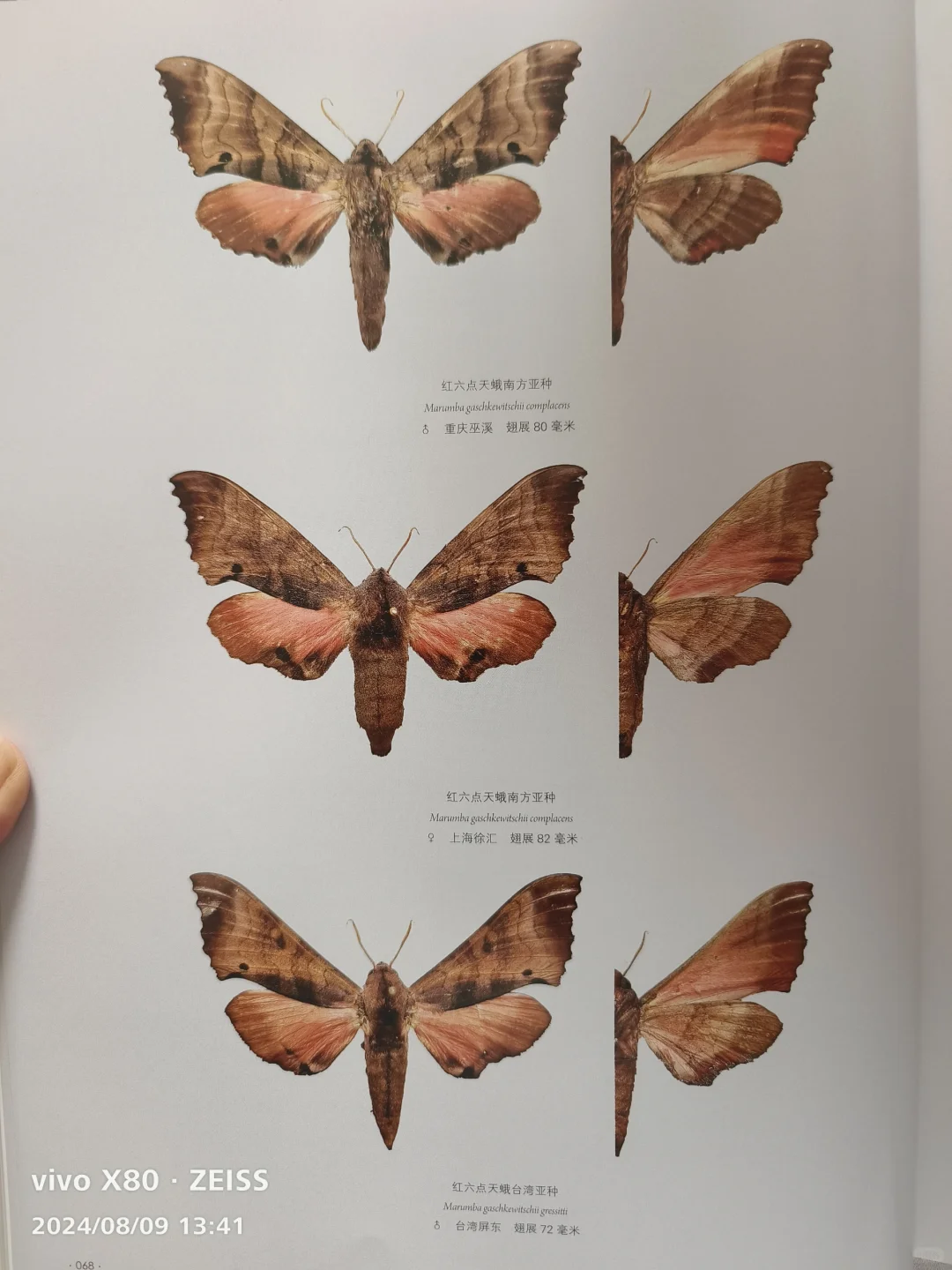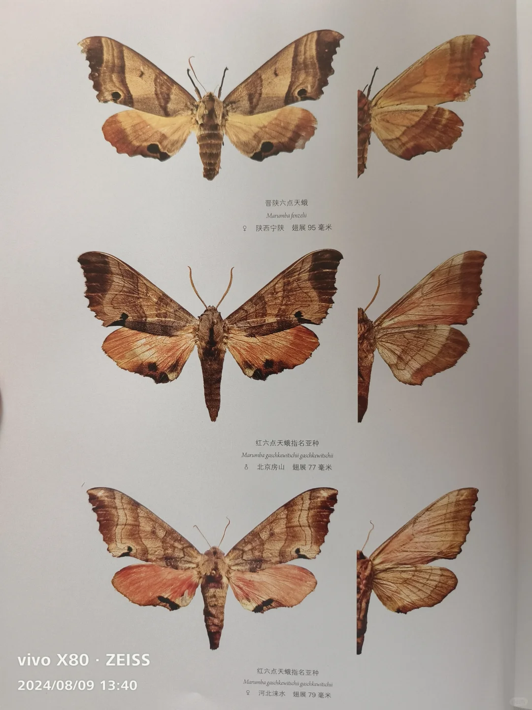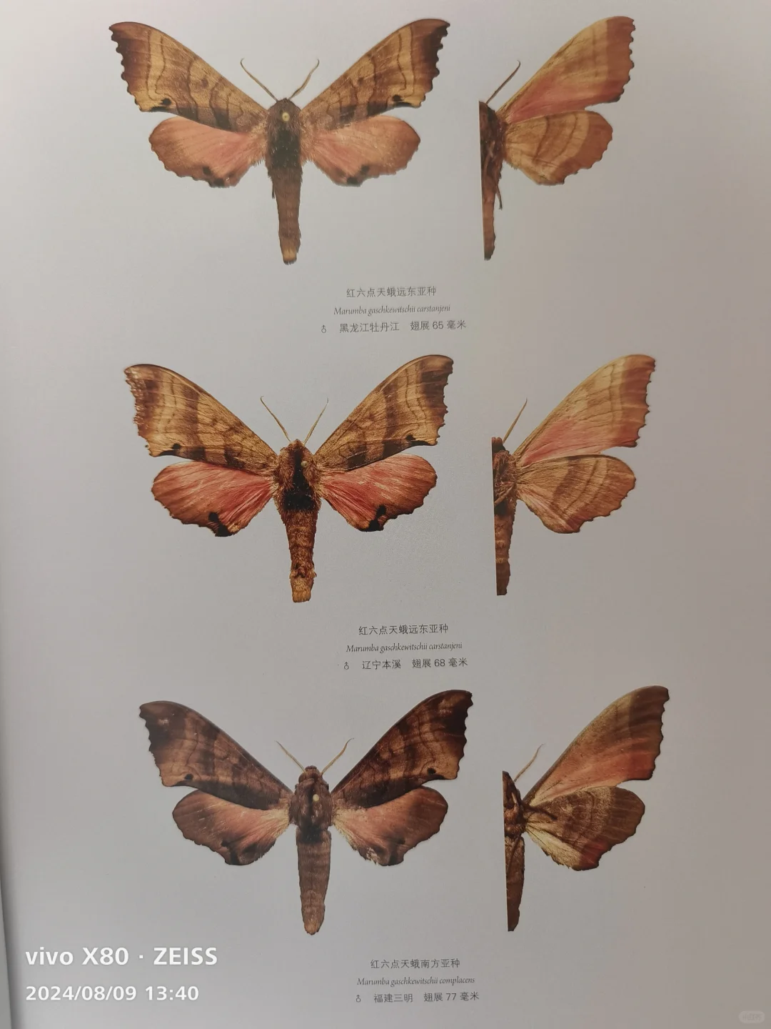 我眼中的秋天 上次介绍了本溪的榆绿天蛾,这次换一个红色的,红六点天蛾Marumba gaschkewitschii,这个属的每个前翅边缘有一个黑点,而后翅各有两个黑点,所以加起来一共六个点,这也是这个属为啥叫六点天蛾属的原因。 我国记录4个亚种。按照分布地,我们看到的这个应该是**亚种ssp.carstanjeni。 图1,实验楼的红六点天蛾, 图2,《中国天蛾科图鉴》的描述, 图3,《中国天蛾科图鉴》中的标本图。