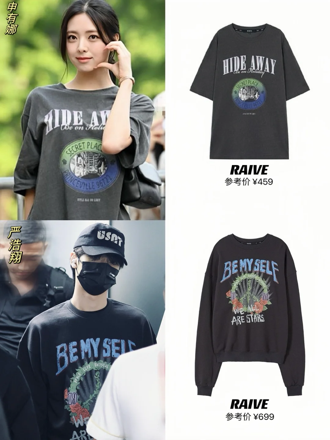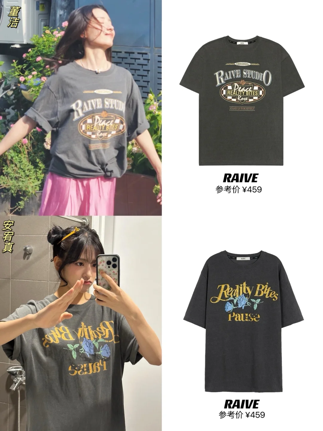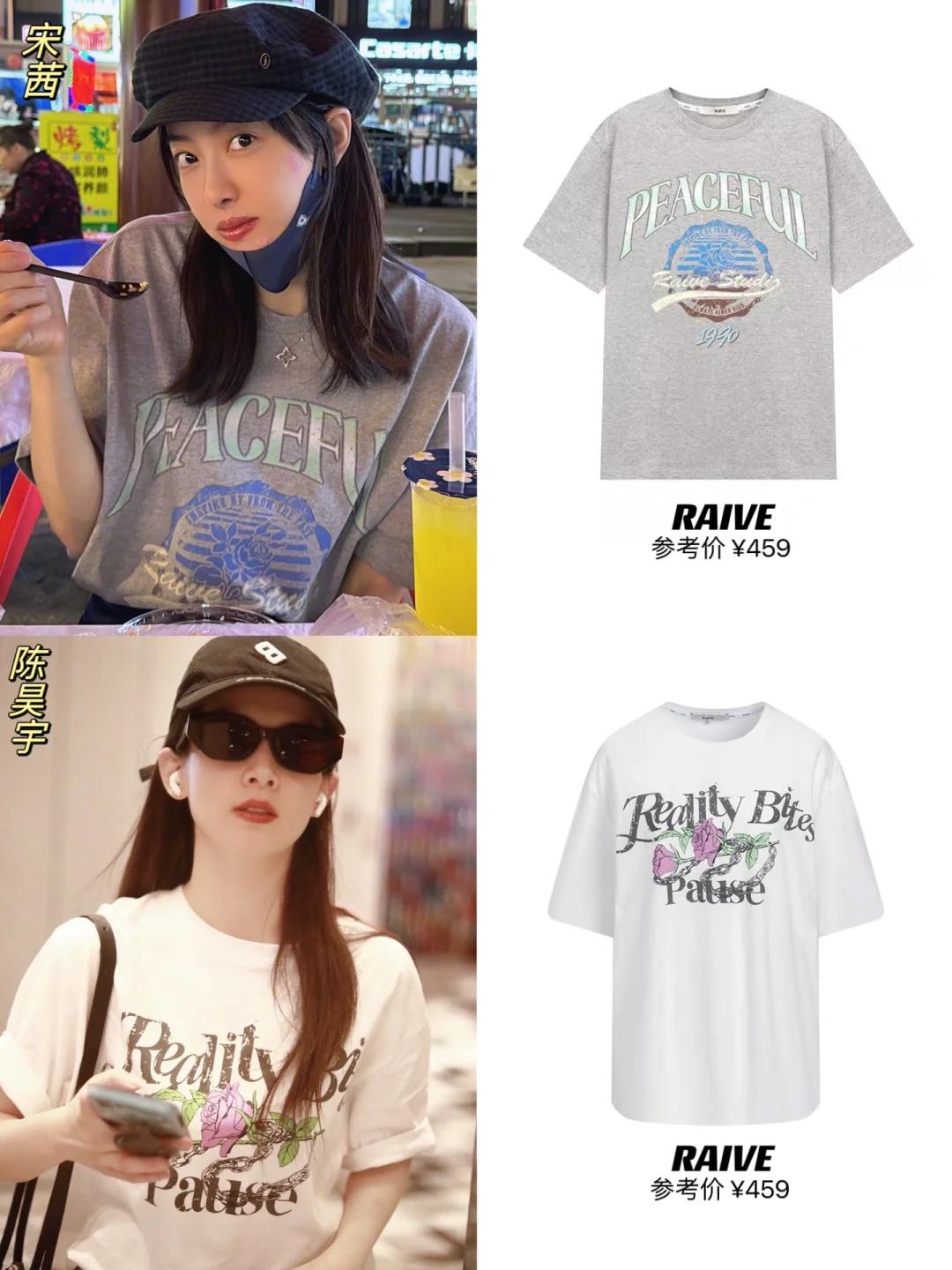 整理近期明星私服,发现了好看的百元复古潮T呀😍!! 爆🔥的RAIVE现在人气太高了吧! 宋茜、董洁、严浩翔、姜敏京、安宥真、申有娜等中韩明星频频上身,张予曦、陈昊宇、陈丽君在浪姐上班路透的私服里都有穿! 同款图案的T恤还有卫衣款,小情侣出街一起穿时髦又吸睛~ 悄咪咪告诉大家,董洁6.29、吴昕6.28的播播间,🉑蹲一下,有香香的好价!!