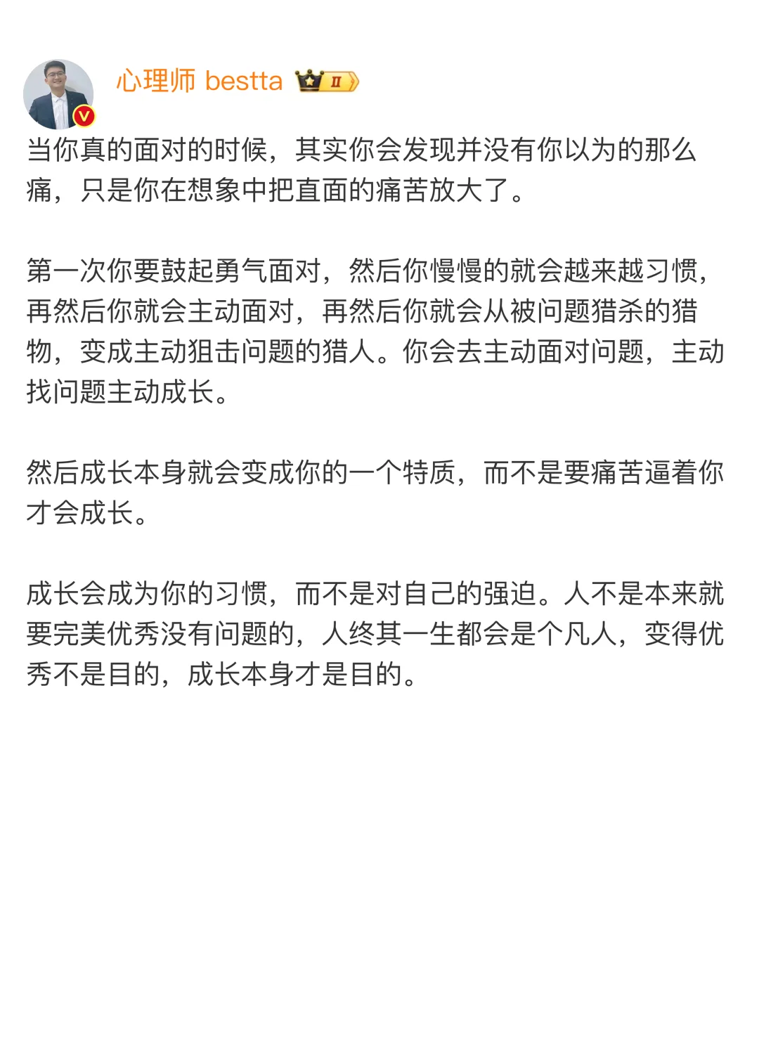 当你真的面对的时候,其实你会发现并没有你以为的那么痛,只是你在想象中把直面的痛苦放大了。