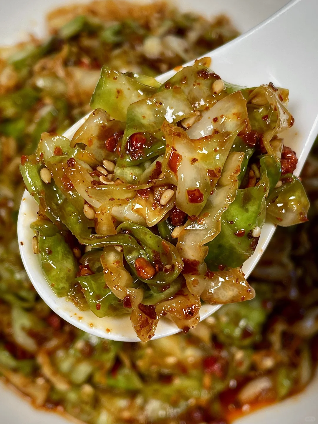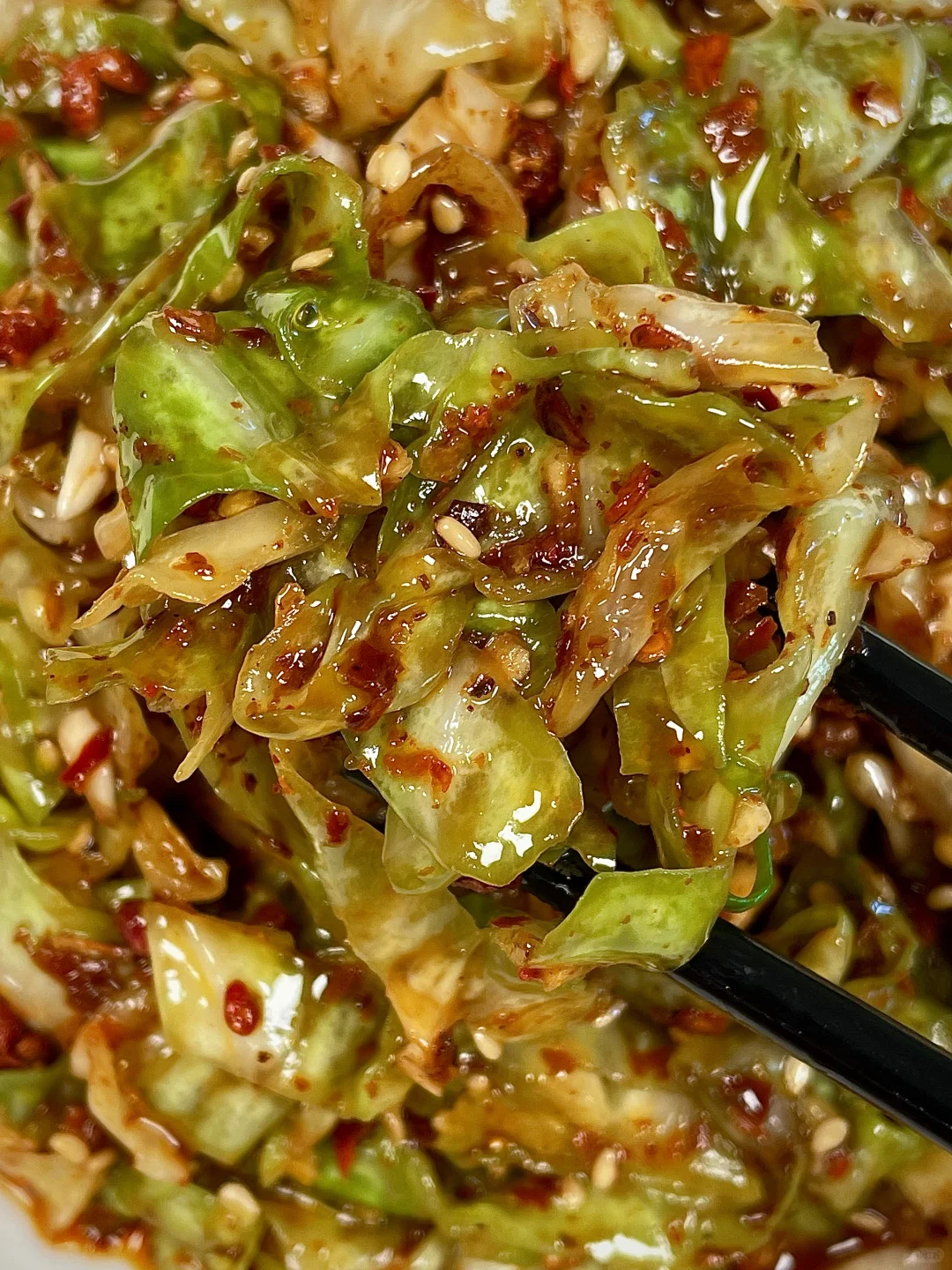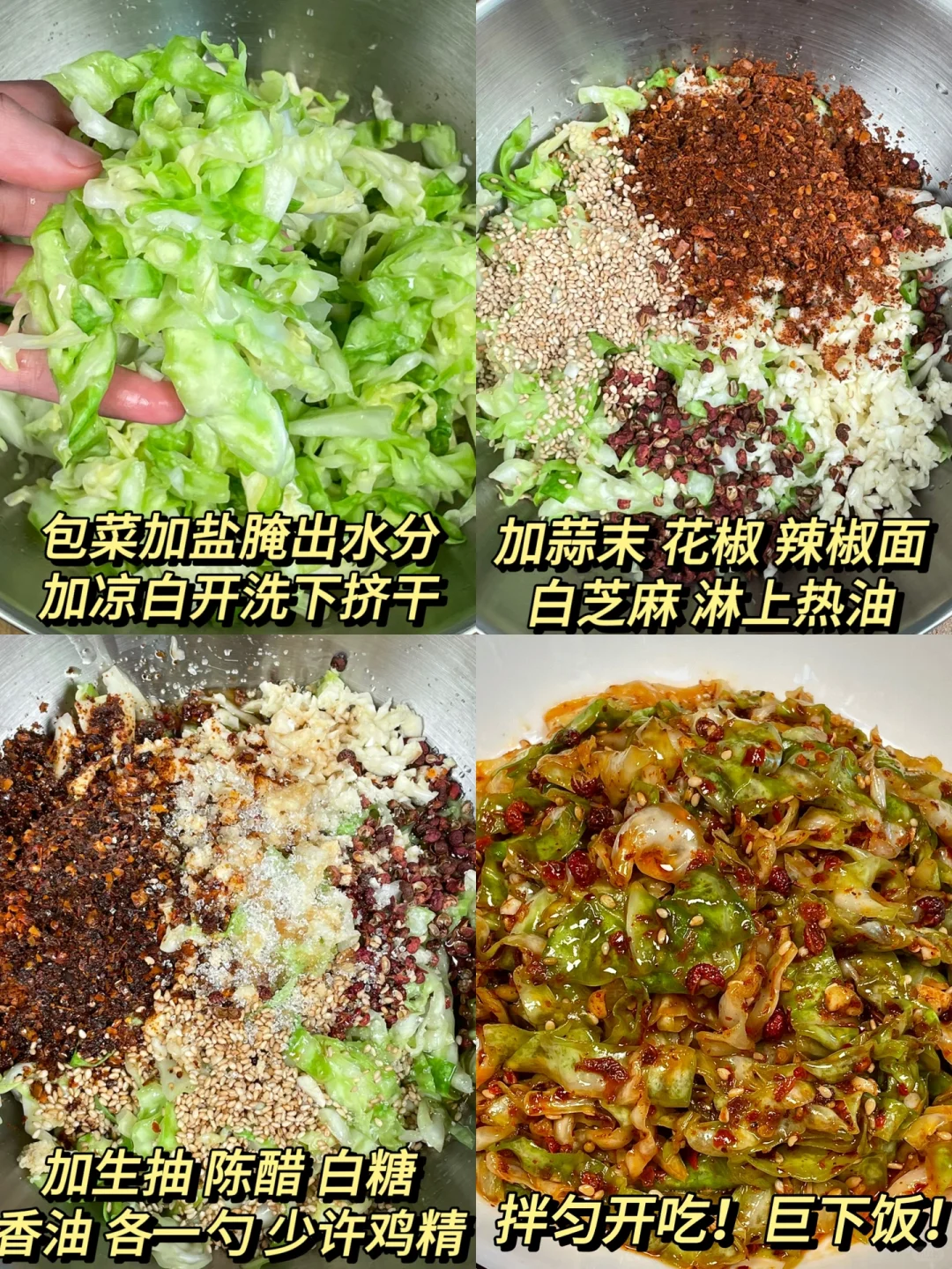 酸辣包菜丝!真的巨巨下饭!一人能炫一盘[色色R] 包菜丝香辣过瘾,酸甜脆爽,一口接一口好吃到停不下来,太香啦[黄金薯R]做法简单,一定要试试!! [向右R]食材:包菜➕蒜末➕花椒➕干辣椒 [向右R]做法:如图所示!