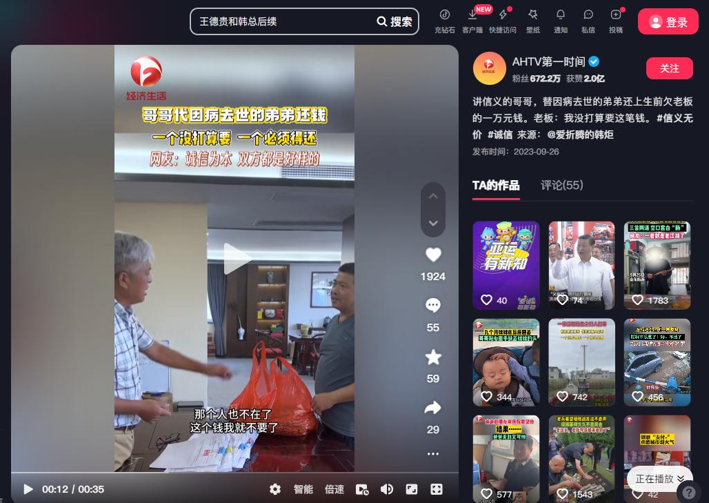 感天动地!安徽,男人生前为治病向老板借了10000块,半年后因病去世,本以为这钱再也追不回,岂料男人的哥哥却找上门来,风尘仆仆从袋子里掏出一摞钱,开口便感动了亿万网友... 网友:活了大半辈子,第一次见有人主动还钱的,这视频让老懒汗颜! (信息来源:信阳微视角2024-08-11《讲信义的哥哥,替因病去世的弟弟还上生前欠老板的一万元钱。老板:我没打算要这笔钱。#信义无价 #诚信 来源:@爱折腾的韩炬》) 常言道,欠债还钱,天经地义,但自打“老赖”成为一种社会现象后,还钱在很多人眼里就成了傻子才干的蠢事... 十几年前,王德贵进入了一家中小企业工作,因为肯吃苦、为人憨厚,备受老板器重。 可谁料,就在他即将春风得意时,一场疾病把这个中年汉子击倒了,为了治病,家里债台高筑借遍了亲朋好友。 手术在即,山穷水尽的王家找到了老板,向他借了一万块救命钱。 然而遗憾的是,尽管掏空了家底,王德贵还是撒手人寰了。 听闻噩耗后,老板也没有催债,甚至再未提起此事,转眼间半年过去了。 这天一个陌生男子走进办公室,手中拎着一袋重重的东西,对话后才得知,他竟是王德贵的亲哥哥。 男人开门见山:“我是来替弟弟还钱的!” 下一秒,从袋子里掏出一摞崭新的百元大钞来,这场面,着实惊呆了周围的同事。 望着男子沧桑的面孔,老板再三表示,这钱就当自己的一份心意,不用还了。 岂料,王德贵的哥哥一脸认真道:“这是我弟弟临死前特地嘱咐的,说家里再穷也得把账还了,人穷志不穷!” 此话一出,老板含泪收下了这沓特殊的钱,为表感激,王德贵的媳妇还从袋子里拿出了一堆家乡土特产,再三谢谢老板这半年来对家里的理解。 谈话中,男人透露自打弟弟走后,生活是一天不如一天,但弟媳妇还是强撑着赚钱,自己也打好几份工,只为了早日把这1万块还上。 随着该条视频传到网上,无数人深有触动。 大家被王氏兄弟的一腔志气感染了,他们虽然生活在社会底层,物质贫乏,接受的教育也不高,却明白欠债还钱,人死账不消的道理。 与此同时,还有网友“含沙射影”道:“真该让我的朋友看看这个视频,欠我的5万块至今没有还的打算,自己却买了轿车四处潇洒!” 还有网友表示,“可惜我没有遇到王德贵这样的人,否则一定倾力相助,帮助他的老婆子女度过眼下的难关!” 对此,你怎么看,欢迎在评论区留言、讨论。