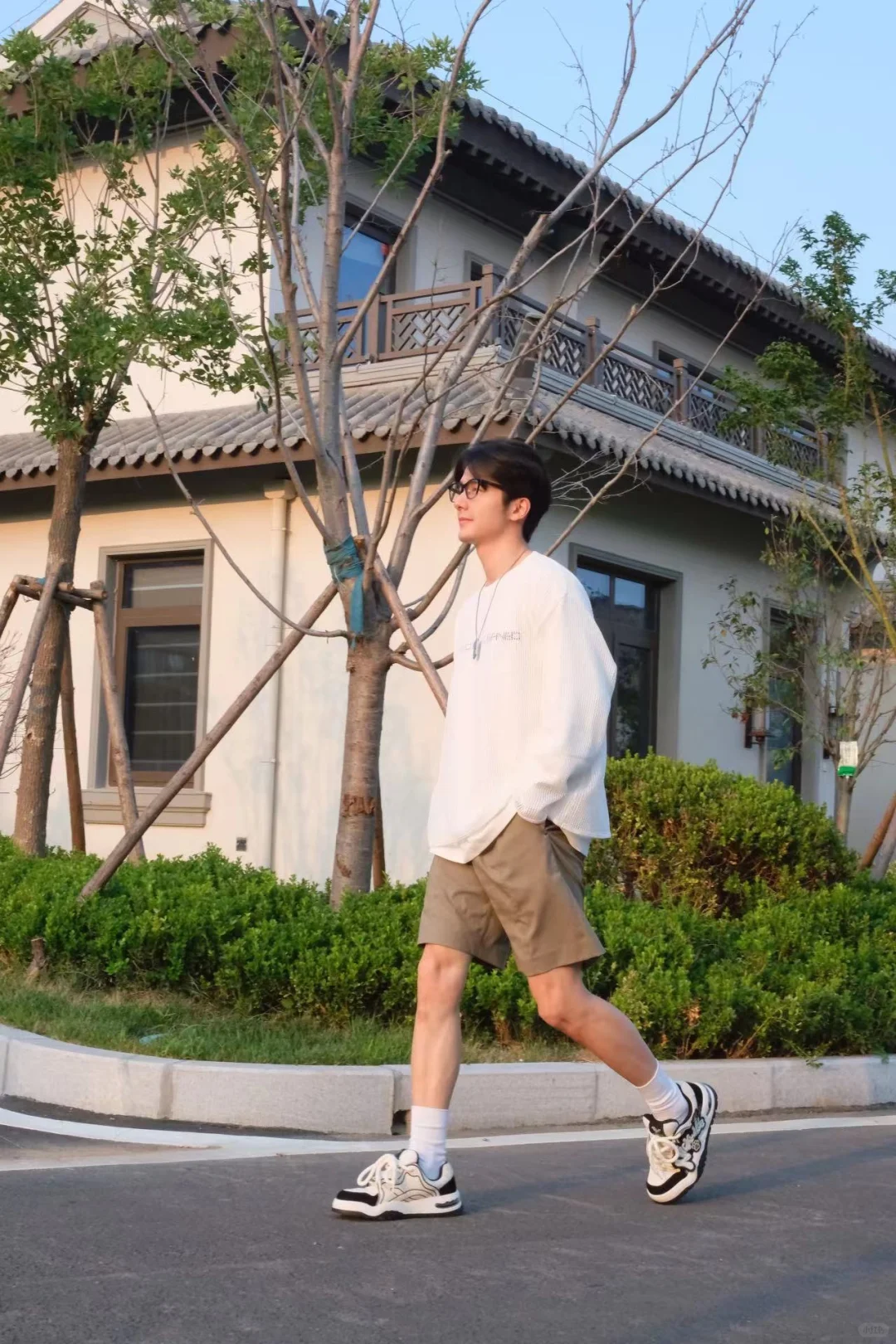 张新成的出街穿搭,citywalk的造型真的休闲又时髦!上身白色长袖上衣下搭五分裤,上脚天美意疯狂动物城贴贴乐,cool~