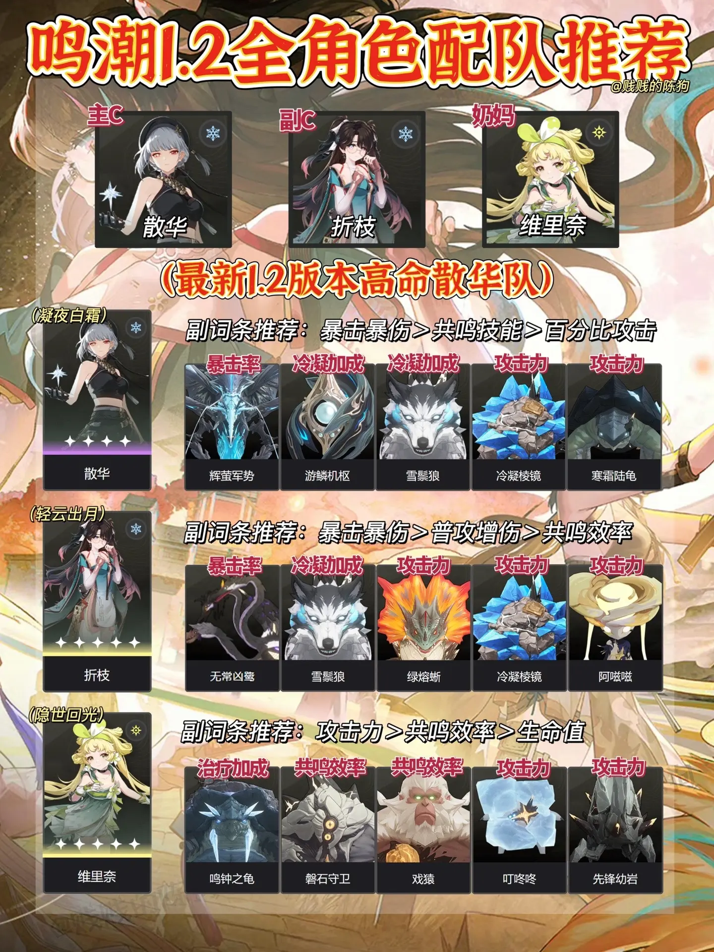 鸣潮|最新1.2版本全角色配队推荐!速来。鸣潮 鸣潮折枝 鸣潮攻略 鸣潮创作者激励计划 鸣潮配队 目前最佳配队:今汐、折枝、维里奈 可以把吟霖留给下版本的相里要了~
