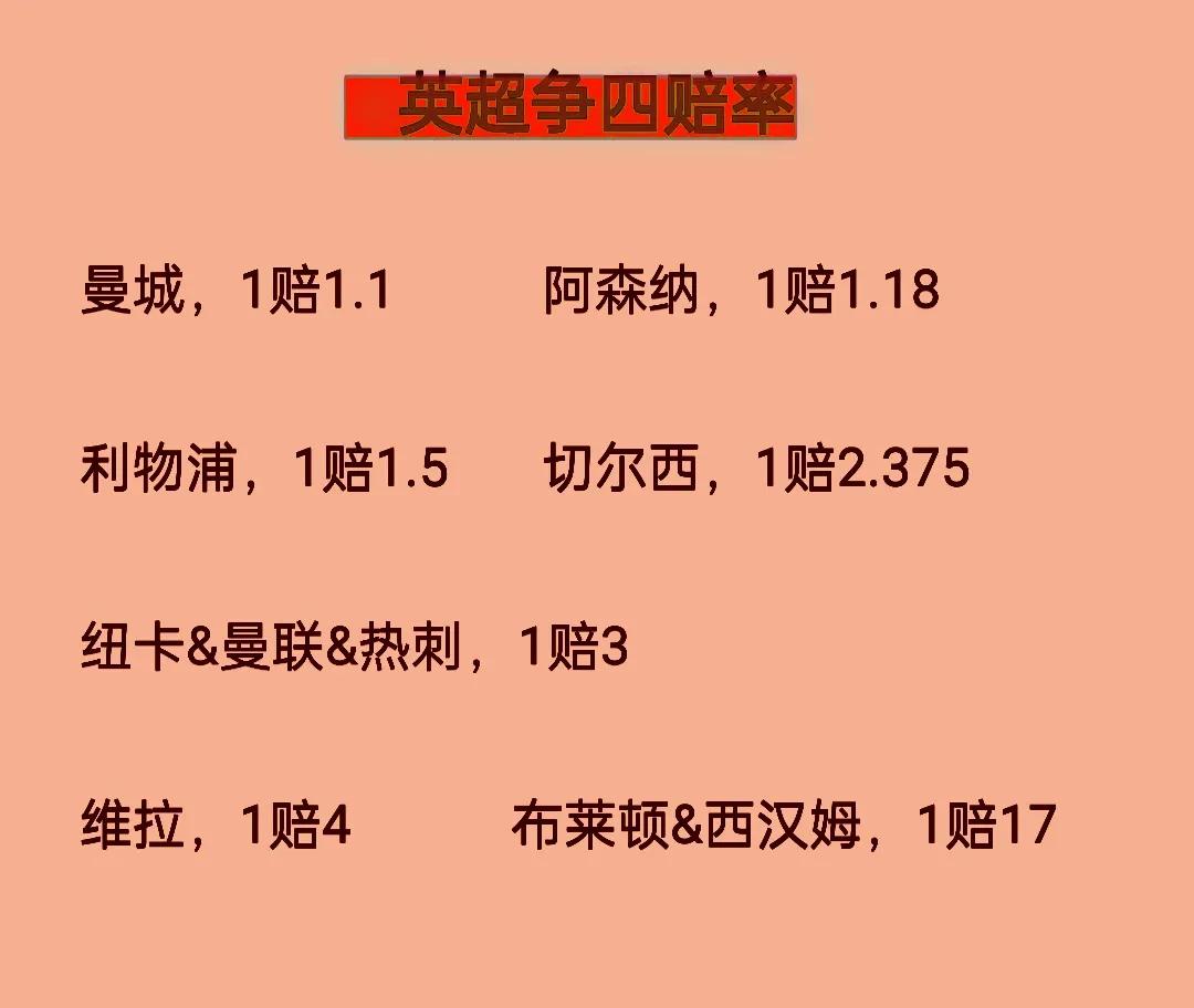 #寻找热爱表达的你#英超2024/25赛季即将重燃战火,相关机构更新了新赛季英超和争四赔率,曼城无悬念超低赔率领跑,连同阿森纳、利物浦、切尔西一起被认为是最有机会赢得前4名的俱乐部。 曼城,1赔1.1,阿森纳,1赔1.18,这两队的赔率低至1.1和1.18,几乎等同于没有悬念地赢得前4名。 利物浦,1赔1.5,这个赔率其实超出我的预料了,利物浦没有补强队伍,关键时告别了名帅克洛普,我对利物浦这么被看好,是不太理解的。 切尔西,1赔2.375,这个没法评价,反正看起来阵容不差,但我就是想不出必进前4的理由。 纽卡&曼联&热刺,1赔3,这仨或有一个能进前3宁呢?尤其是曼联,今赛季的阵容变化挺大可能成为冠军搅局者。 维拉,1赔4,进钱4的赔率排名第八,中规中矩吧,能进前4是惊喜,赢得一个欧战名额是靠谱的。 布莱顿&西汉姆,1赔17:其实基本上没啥机会进前4了。#看球# #英超为啥这么火#