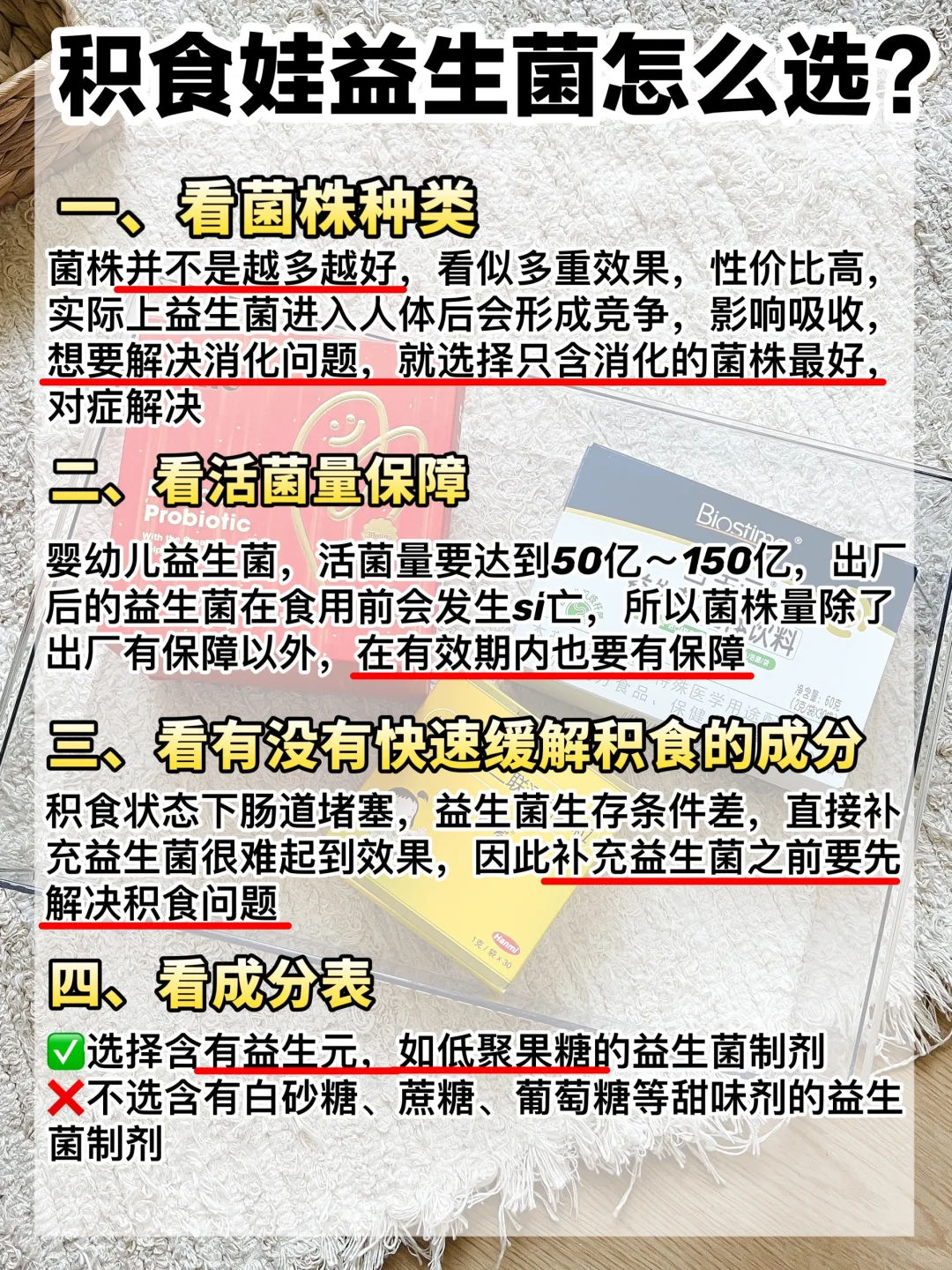 宝宝积食状态下肠道堵塞,益生菌生存条件差,直接补充益生菌很难起到效果,所以补充益生菌之前要先解决积食问题,有没有快速缓解积食、疏通肠道的成分也是攻略的一环