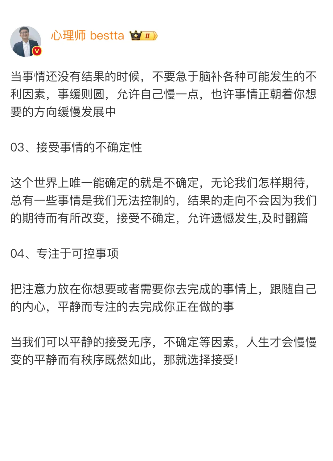 这个世界上唯一能确定的就是不确定,无论我们怎样期待,总有一些事情是我们无法控制的,结果的走向不会因为我们的期待而有所改变,接受不确定,允许遗憾发生,及时翻篇。