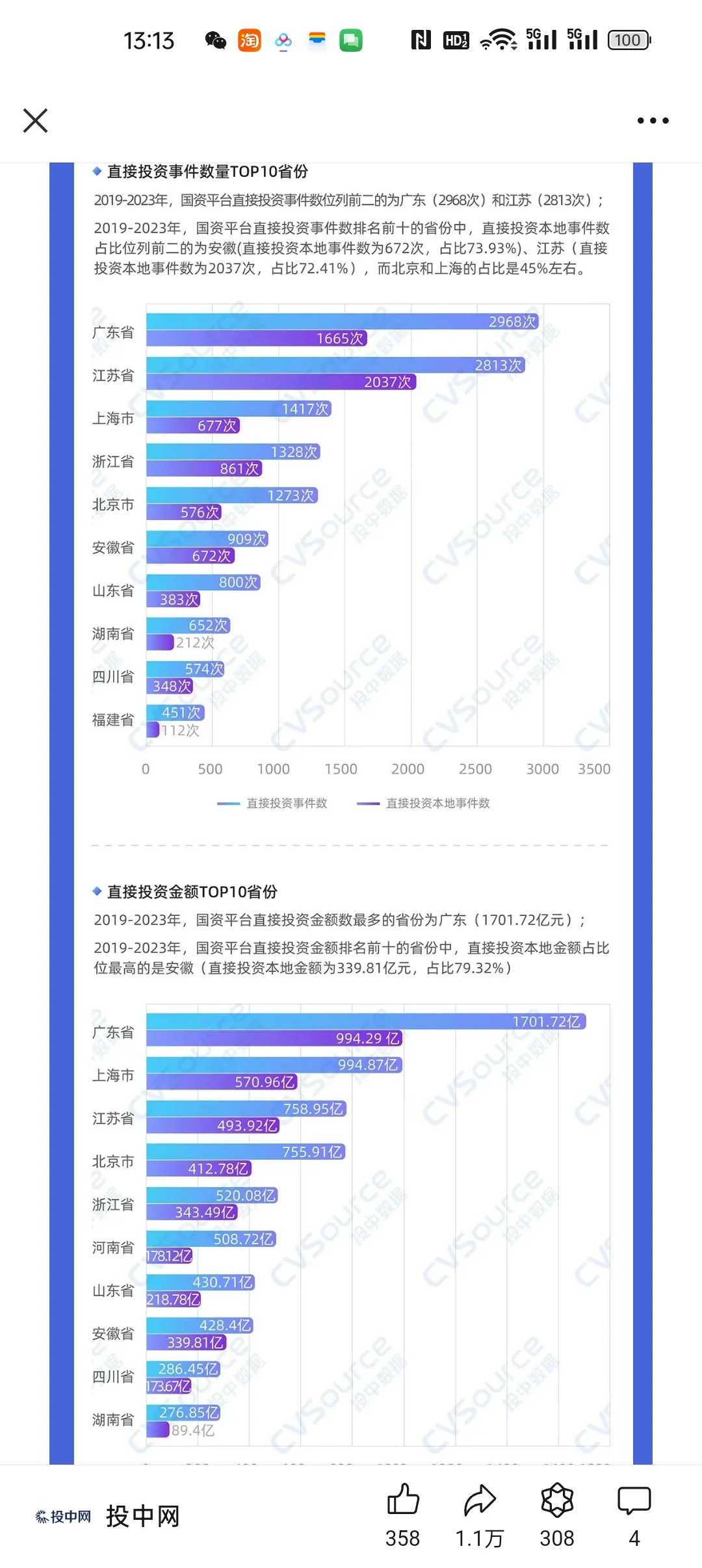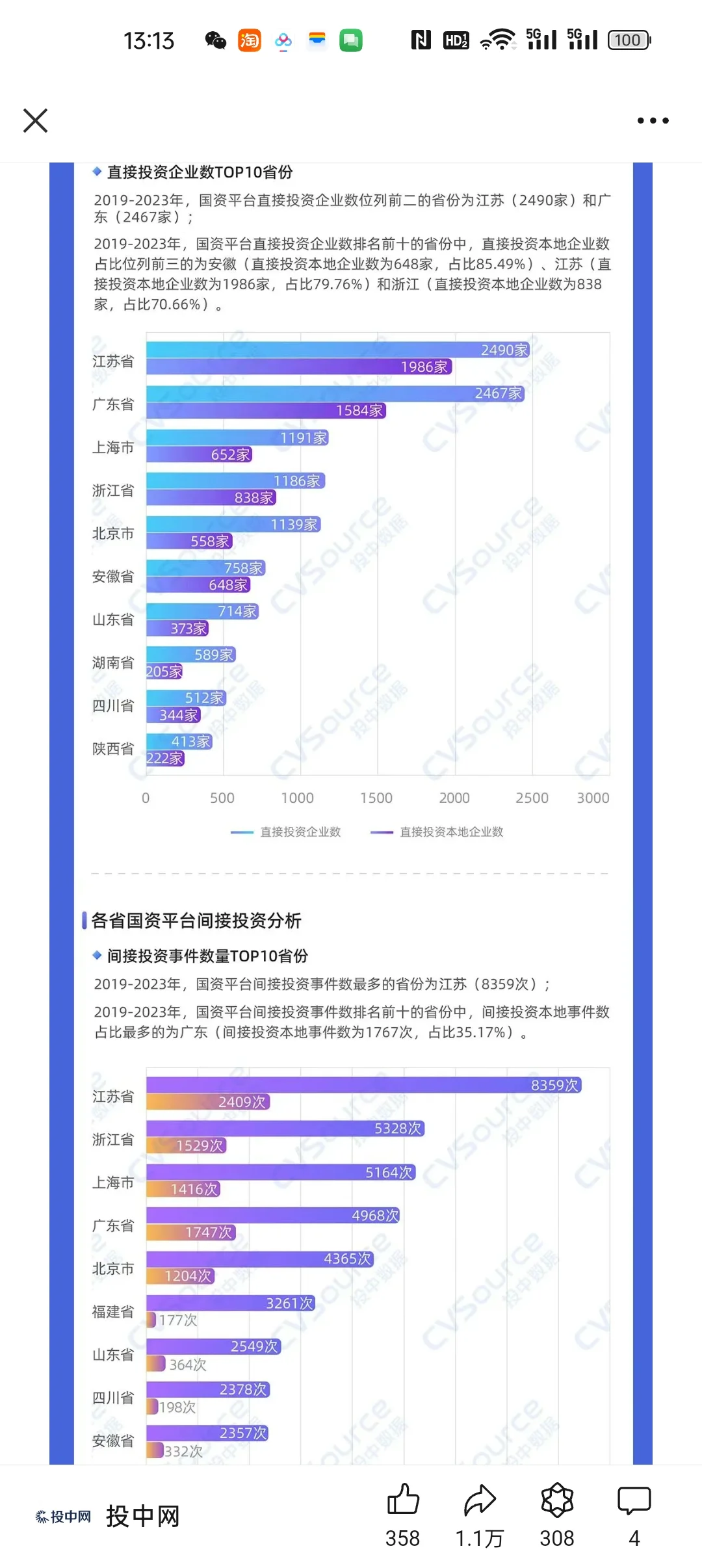 [一R]G资投资到底有多凶猛。2019-2023,全国G资机构直接投资63663.47e。其中,并购交易占比过半,金额达33519.90e;新股发行15662.48e。除此之外的企业融资部分,G资直接投资金额15868.49e,投资企业12852家。意味着,不算并购、新股发行,全国有38279家企业获得股权投资,融资总金额62697.43e,这里面每3家企业中,就有一家企业被G资机构直投;每融资100元,就有25元直接出自G资之手。