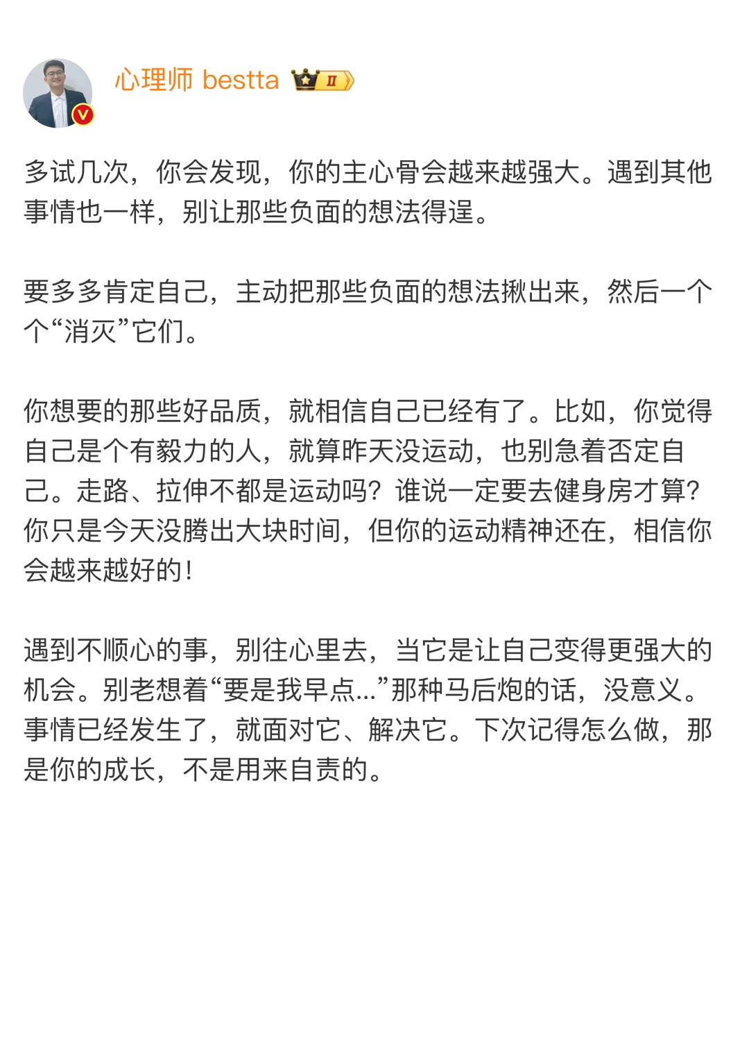 你想要的那些好品质,就相信自己已经有了。比如,你觉得自己是个有毅力的人,就算昨天没运动,也别急着否定自己。走路、拉伸不都是运动吗?谁说一定要去健身房才算?你只是今天没腾出大块时间,但你的运动精神还在,相信你会越来越好的!