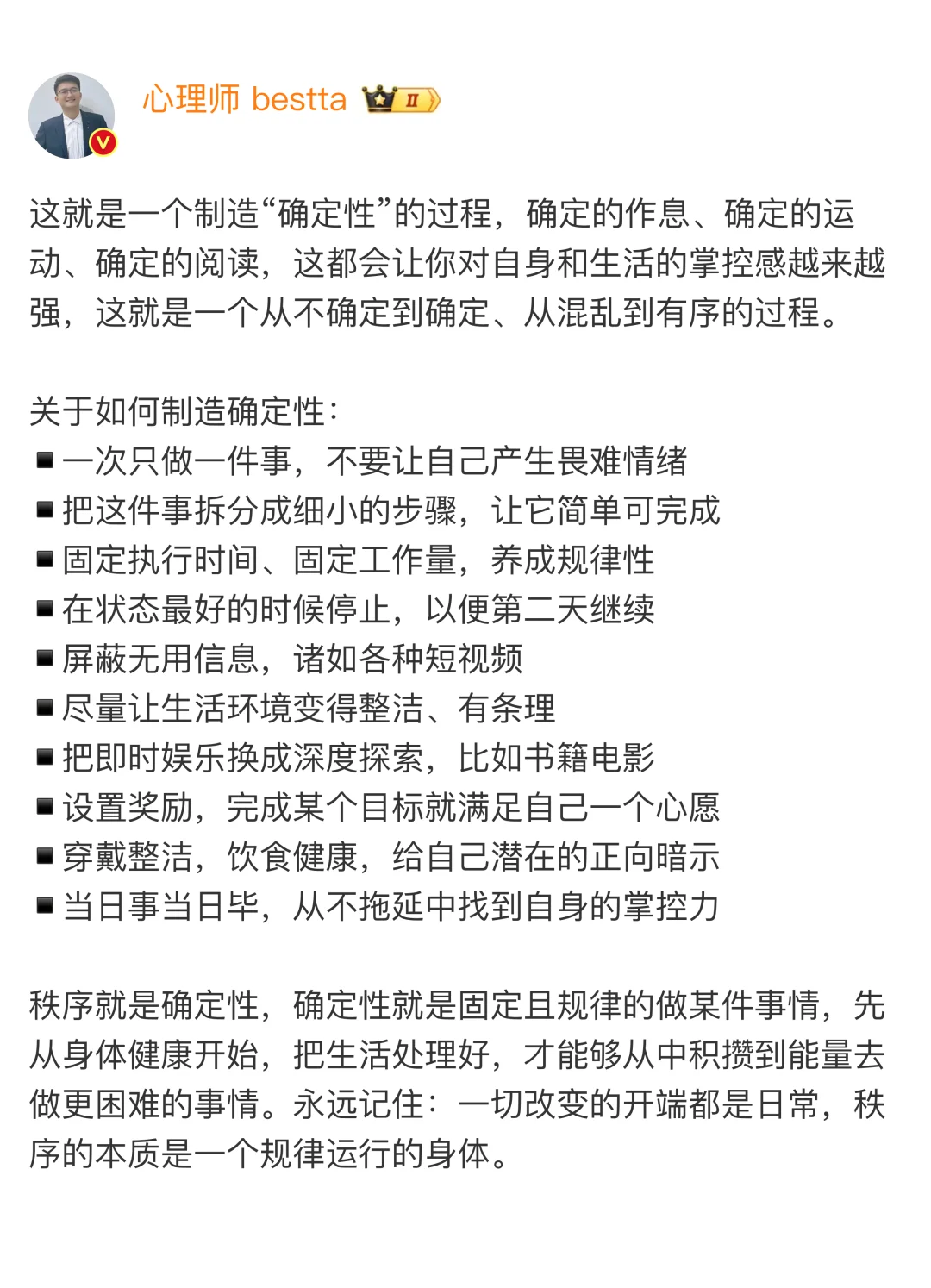 秩序就是确定性,确定性就是固定且规律地做某件事情,先从身体健康开始,把生活处理好,才能够从中积攒到能量去做更困难的事情。