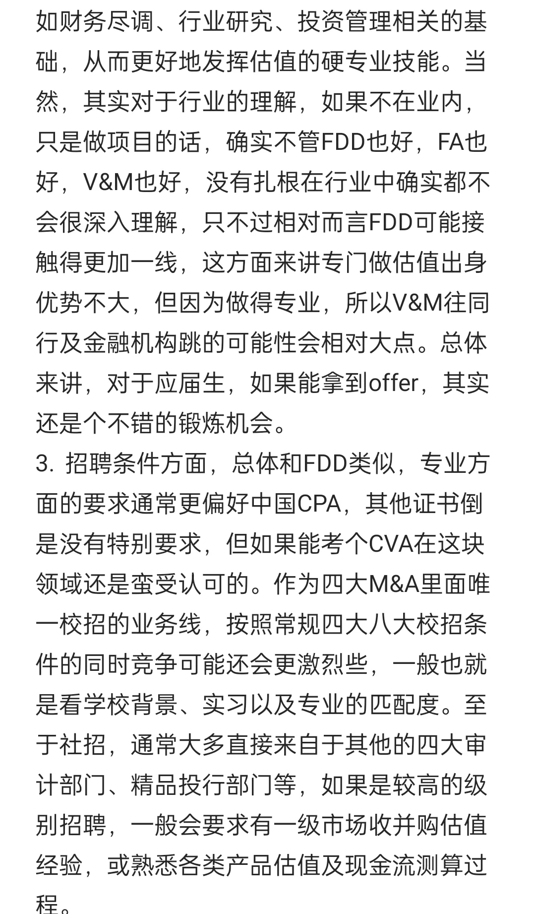 但终归是人家四大的重要业务和竞争力体现,咱先不说在服务中的价值体现,单就大家最关心的值不值得去、这工作对个人值不值得做这件事来说说。应该讲,如果是为了个人的求职跳槽,这一技能肯定是必备的。刚刚提到了估值在投资环节里面是必备的,因此跟投资、投行类工作必然是有匹配度的,属于是硬技能之一,但要更好地发挥这一硬技能,是需要去补充例如财务尽调、行业研究、投资管理相关的基础的。至于应届生值不值得去以及招聘的条件,我从几方面提供些信息供参考吧,详见图2-图3~