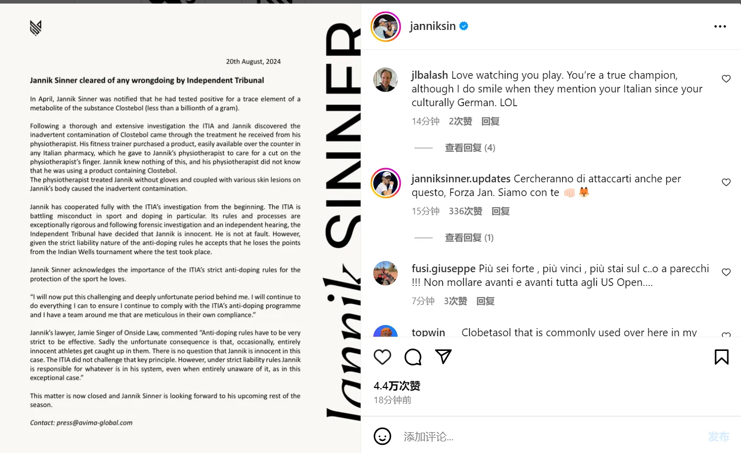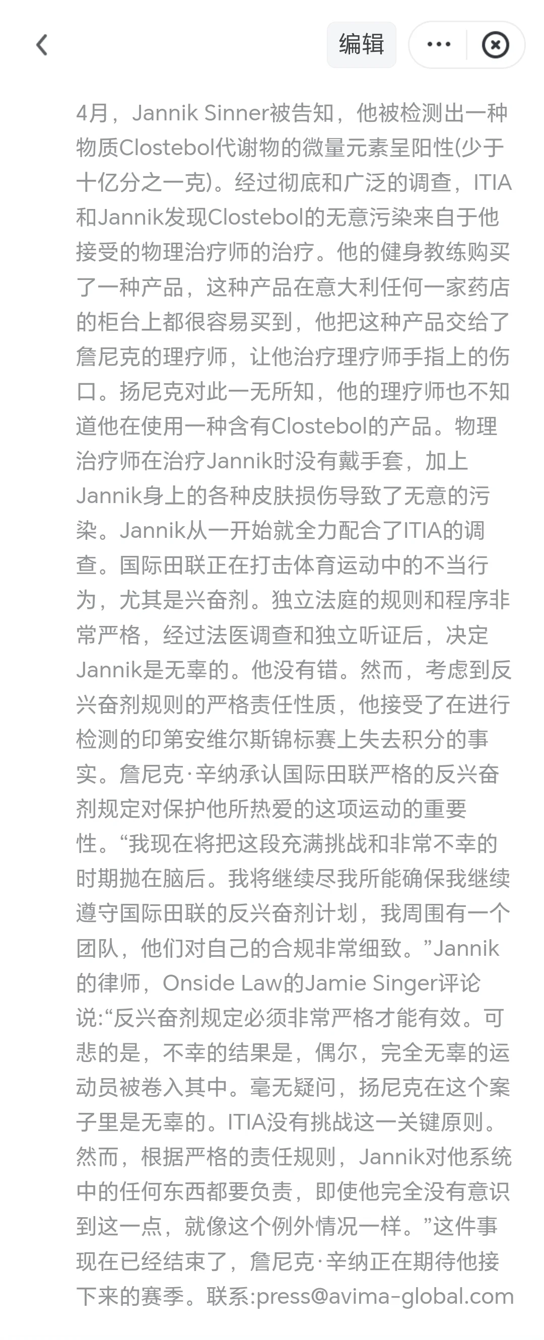 ATP也针对辛纳此次事件发表了声明:「我们很高兴地发现,雅尼克·辛纳没有任何过错或疏忽。我们还要感谢网球反兴奋剂计划 (TADP) 的调查过程和对事实独立评估的严谨性,这让他得以继续比赛。这对辛纳和他的团队来说是一个具有挑战性的事件,并强调了球员及其随行人员在使用产品或治疗时必须格外小心。诚信在我们的运动中至关重要。」