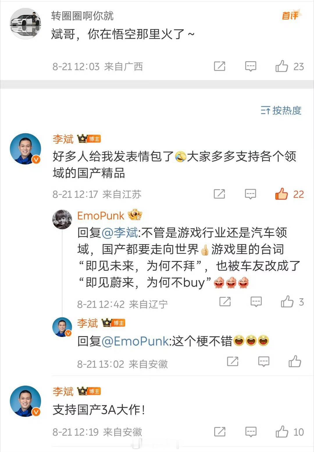 这两天光顾着陪小学女神了,好像错过一款国产爆火游戏 #黑神话悟空# ,但也刷到了一个梗,李斌的格局真真可以,很大气,也开得起玩笑,好感度暴增。这一波黑神话悟空人气拉满,蔚来甚至乐道也是赢家!#东北电吹#
