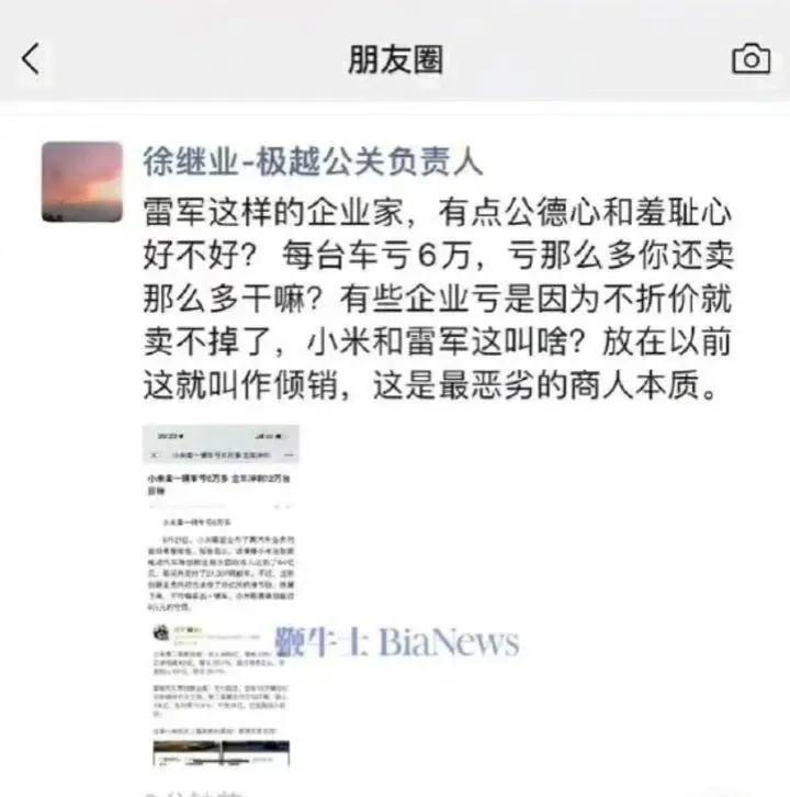 极越汽车公关负责人徐继业公开炮轰雷军和小米汽车亏钱卖车,这个极越汽车到底啥来头啊? 今天刷到资讯说,极越汽车公关负责人徐继业在朋友圈炮轰小米和雷军亏钱卖车。 徐继业表示:“雷军这样的企业家,有点公德心和羞耻心好不好?每台车亏6万,亏那么多你还卖那么多干嘛?有些企业亏是因为不折价就卖不掉了,小米和雷军这叫啥?放在以前这就叫作倾销,这是最恶劣的商人本质。” 不查不知道,一查吓一跳,这个极越汽车来头大的很,但是销量很孤寒。 先说来头,极越汽车是百度与吉利联合成立的汽车品牌,两大股东都是重量级的,看起来做好这个品牌易如反掌吧? 再看销量,1月至4月,极越销量分别为218辆、147辆、511辆和362辆,月销不足千辆。5月份,极越销量首次超过1000辆,达1001辆,但6月份又腰斩至461辆。1—6月份累计销售2700辆。 一家车企半年销量2700辆,大家猜猜这公司摊销下来每辆车得亏多少钱?以及,大家觉得这个品牌后续两三年还立得住吗?