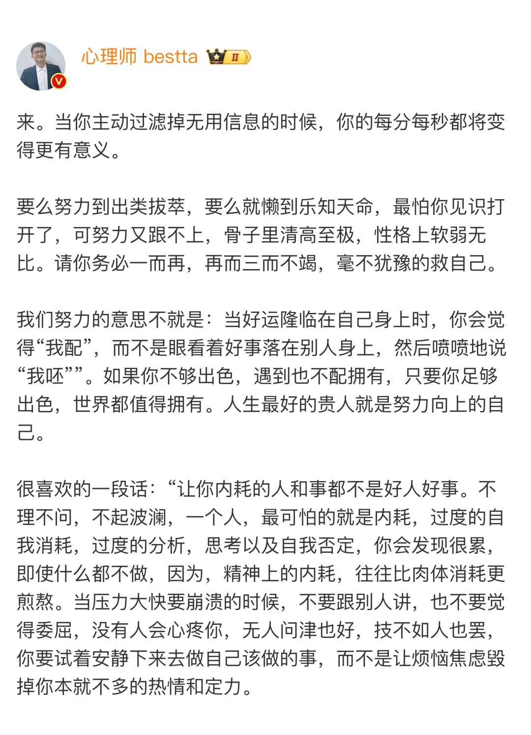很喜欢的一段话:“让你内耗的人和事都不是好人好事。不理不问,不起波澜,一个人,最可怕的就是内耗,过度的自我消耗,过度的分析,思考以及自我否定,你会发现很累,即使什么都不做,因为,精神上的内耗,往往比肉体消耗更煎熬。