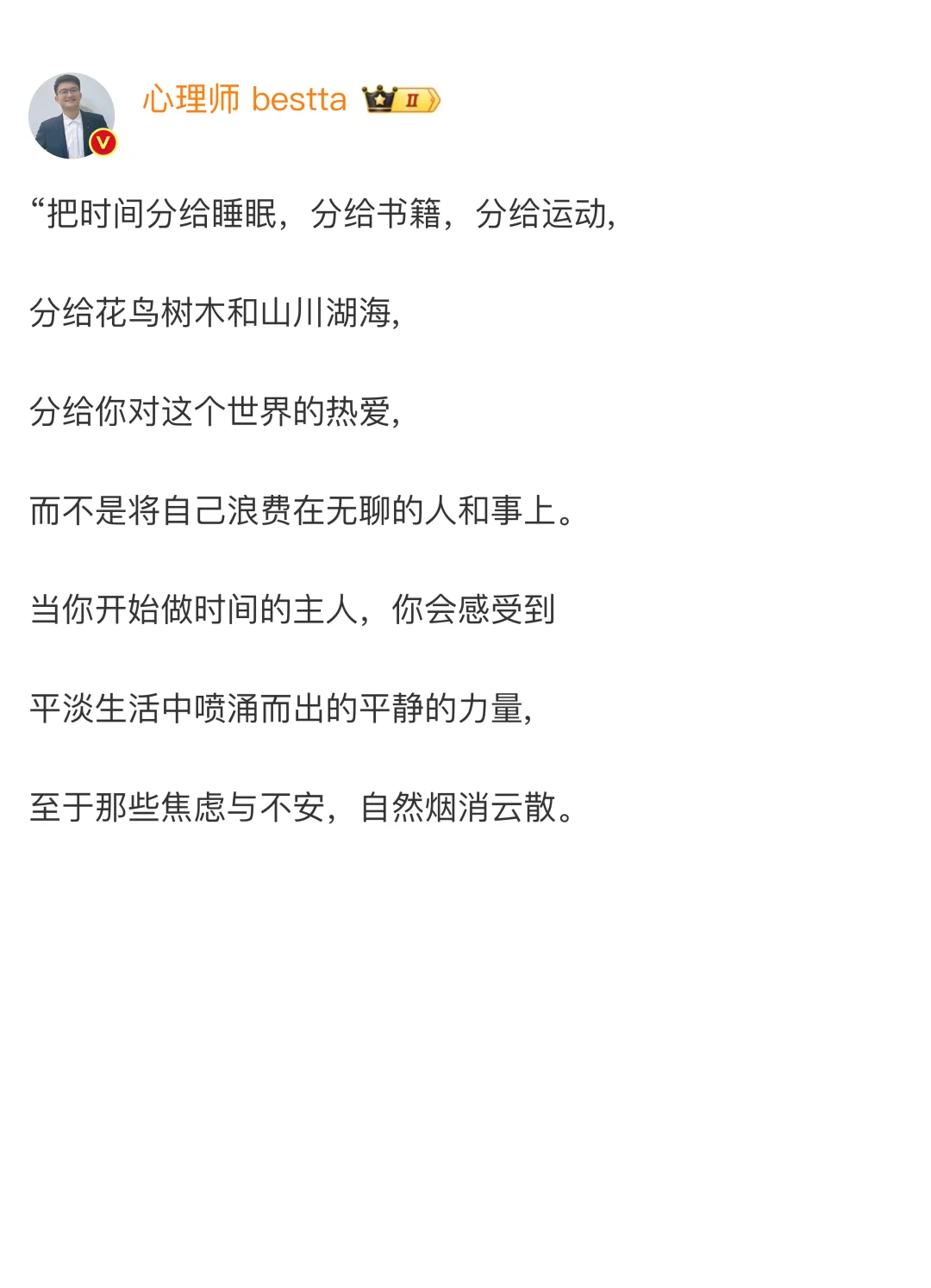 “把时间分给睡眠,分给书籍,分给运动