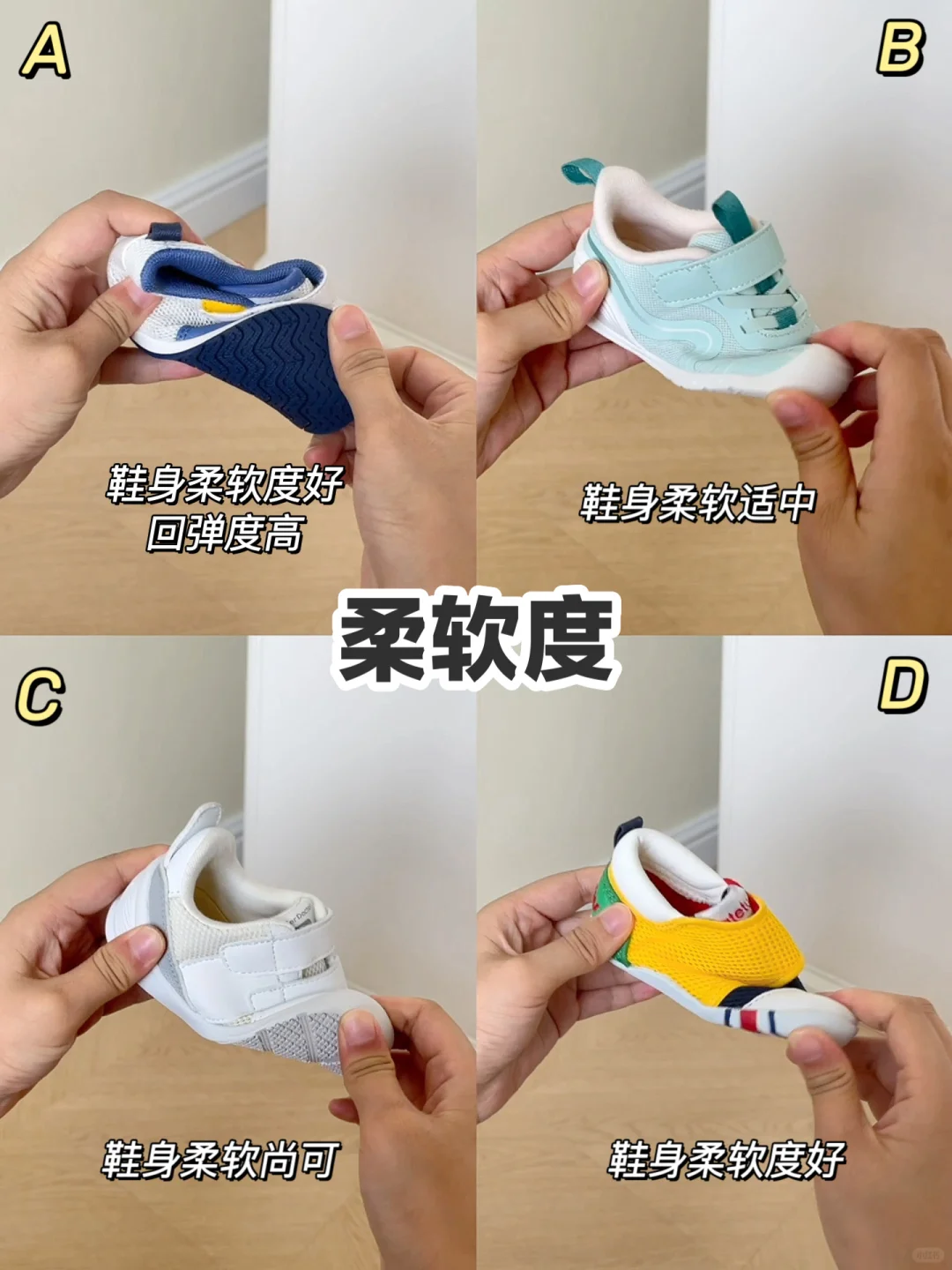 试一下鞋底是否够薄赤足感强,宝宝能够更好的感知地面,试一下鞋子是否防滑又能提升抓地力,试一下鞋子大小,鞋子比脚长大0.5cm~1cm就可以,不要贪大,鞋头是否舒适不挤脚