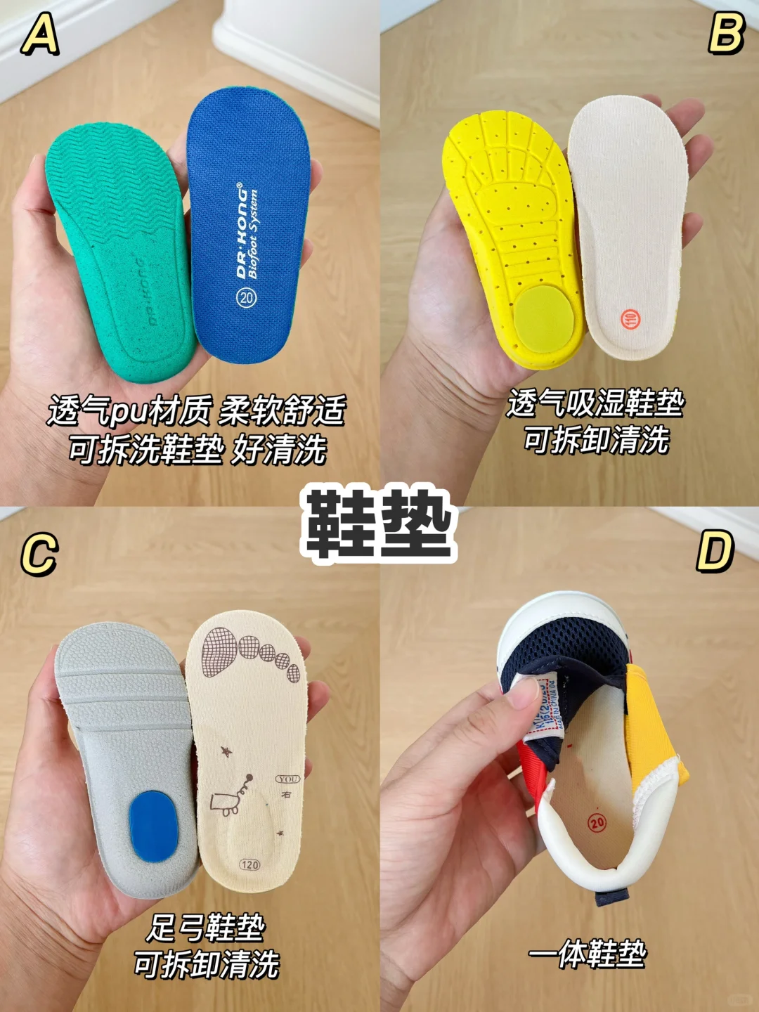 看鞋面材质,是否透气,看鞋垫是否能拆卸清洗,一段学步鞋不需要有足弓垫,看是否有魔术贴好穿脱