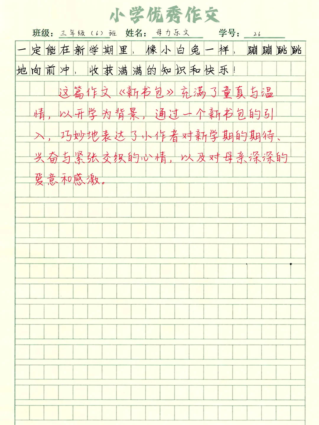 这篇作文《新书包》充满了童真与温情,以开学为背景,通过一个新书包的引入,巧妙地表达了小作者对新学期的期待、兴奋与紧张交织的心情,以及对母亲深深的爱意和感激。以下是对这篇作文的点评: