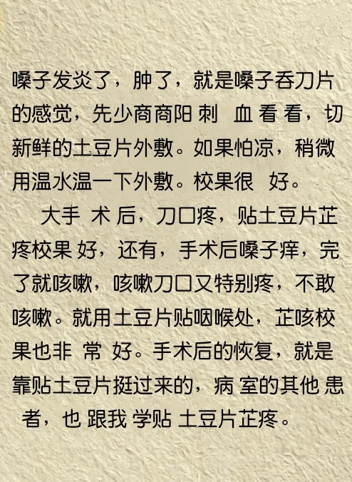 刀口疼贴土豆片芷疼,嗓子痒贴土豆片芷咳