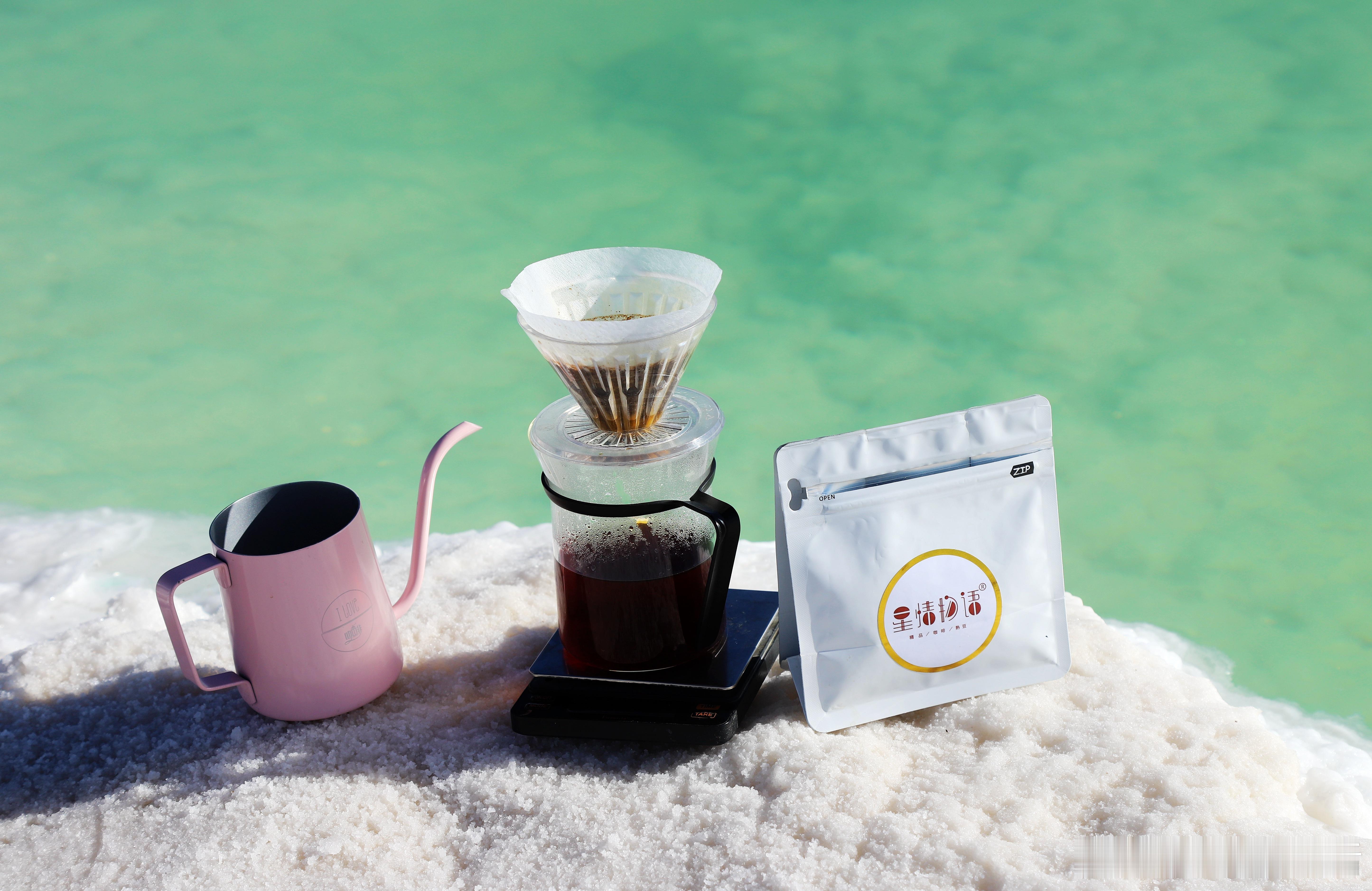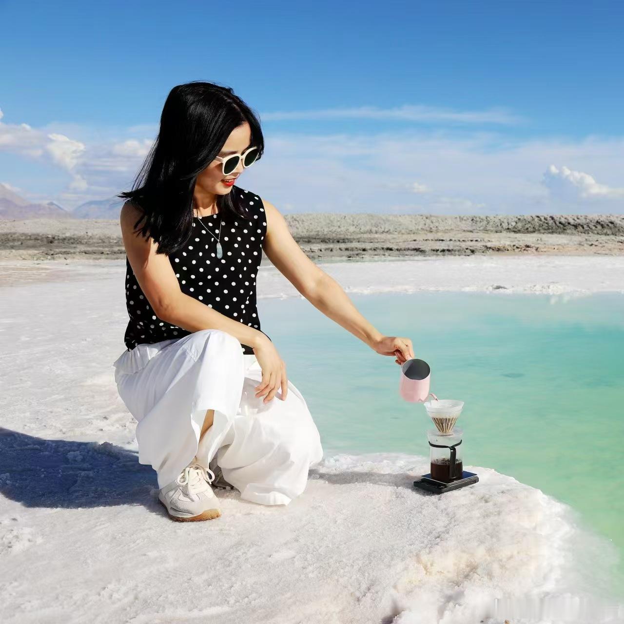 打卡青海网红景点:大柴旦翡翠湖,天气不,气温35度。在湖边手冲一杯巴拿马瑰夏咖啡,真美[666]#星情物语##咖啡##喝咖啡##大柴旦翡翠湖#