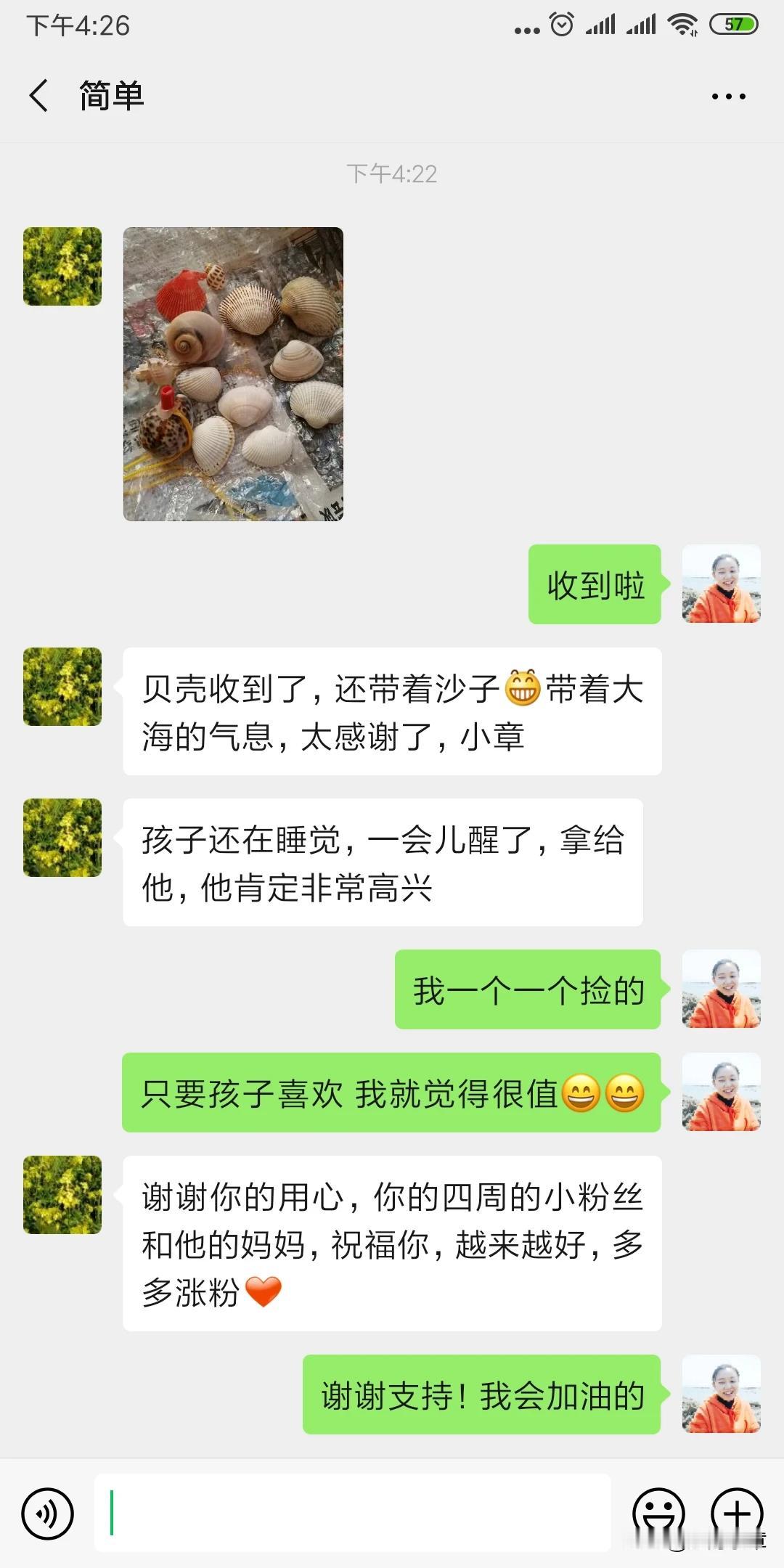 我每次到海边捡贝壳,总有路过的人说这些东西没用的,那是因为他们不知道,远方的孩子有多喜欢这些纯天然的东西。我能让他们听到大海的声音,我感到很自豪[得意][得意][得意]
