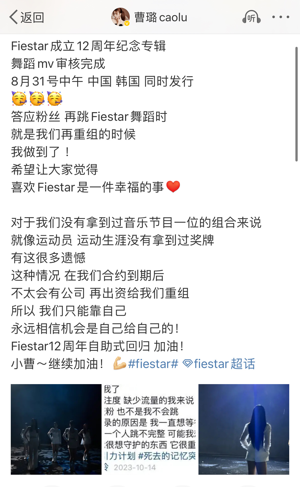 #FIESTAR重组发歌##FIESTAR合体发歌# 曹璐所在的FIESTAR将以完整体重组。这距离她们在2018年正式解散已有约6年之久。FIESTAR将于31日发行新歌。为了纪念出道12周年,FIESTAR计划发行新歌并与粉丝们互动。