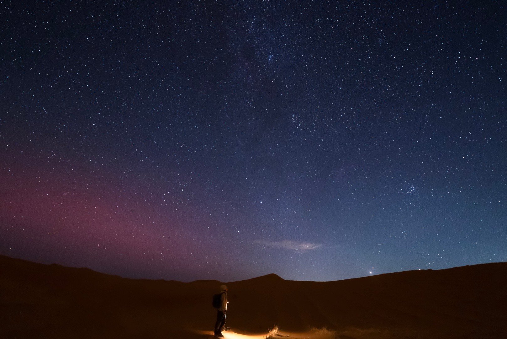 飞行1000km自驾惊喜地遇见“开往月球”的道路,可定格她的时候她却快速的下落,落幕后的夜空却让繁星更清晰了轮廓,流星在四面八方散开,极光罕见地飞舞在北纬38度的天空幕布中,地面的凉气和微风清醒了躺在沙丘快要睡着的我,止不住地拍摄到冬季猎户逐渐从东方升起迎来绝美的日出…